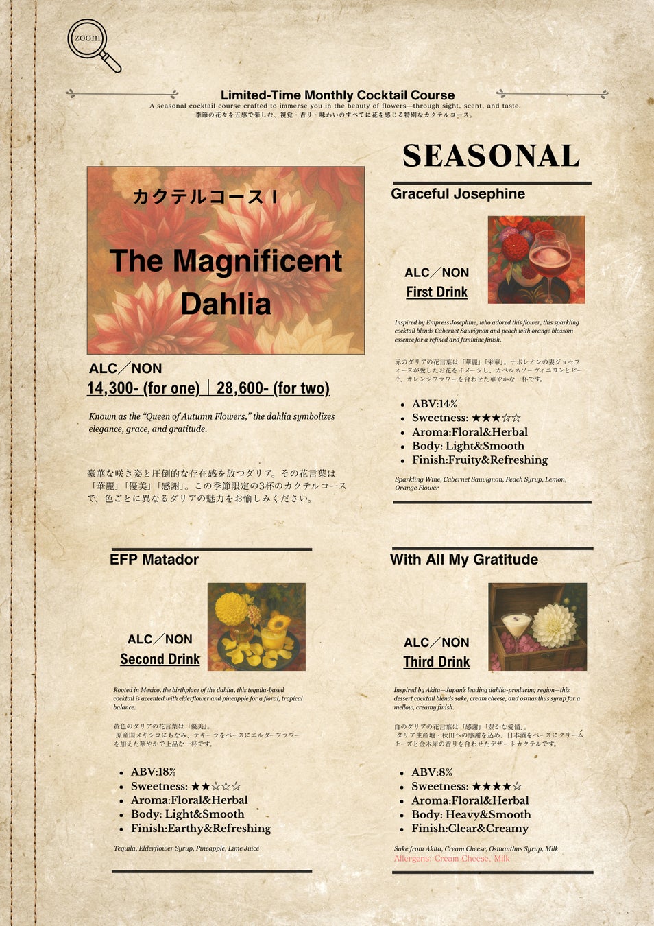 会員制フラワーバー「EBISU FLOWER PARK(エビスフラワーパーク)」は、2025年11月限定の季節のカクテルコース「The Magnificent Dahlia(ザ・マグニフィセント・ダリア)」を発表いたします。