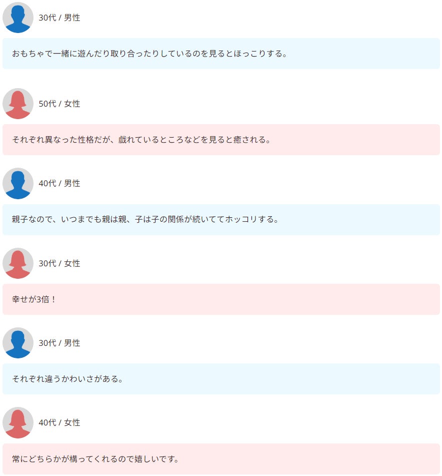 「それぞれに違う可愛さがある」「常にどちらかが寄り添ってくれるのが嬉しい」といった多頭飼いならではの魅力も挙がっています。
