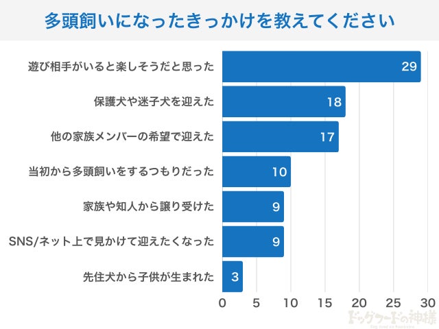 多頭飼いを始めた理由で最も多かったのは「遊び相手がいると楽しそう」という回答で、52名中29名が選びました。