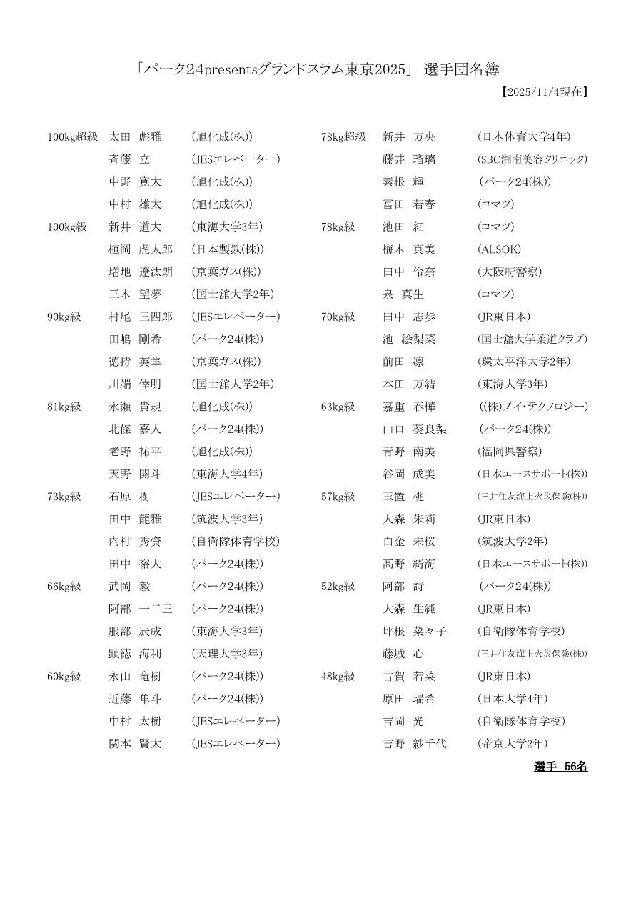 公益財団法人全日本柔道連盟は、11月4日(火)に開催した強化委員会において、「パーク24presentsグランドスラム東京2025」の日本代表選手に関する審議を行い、以下の通り発表しました。