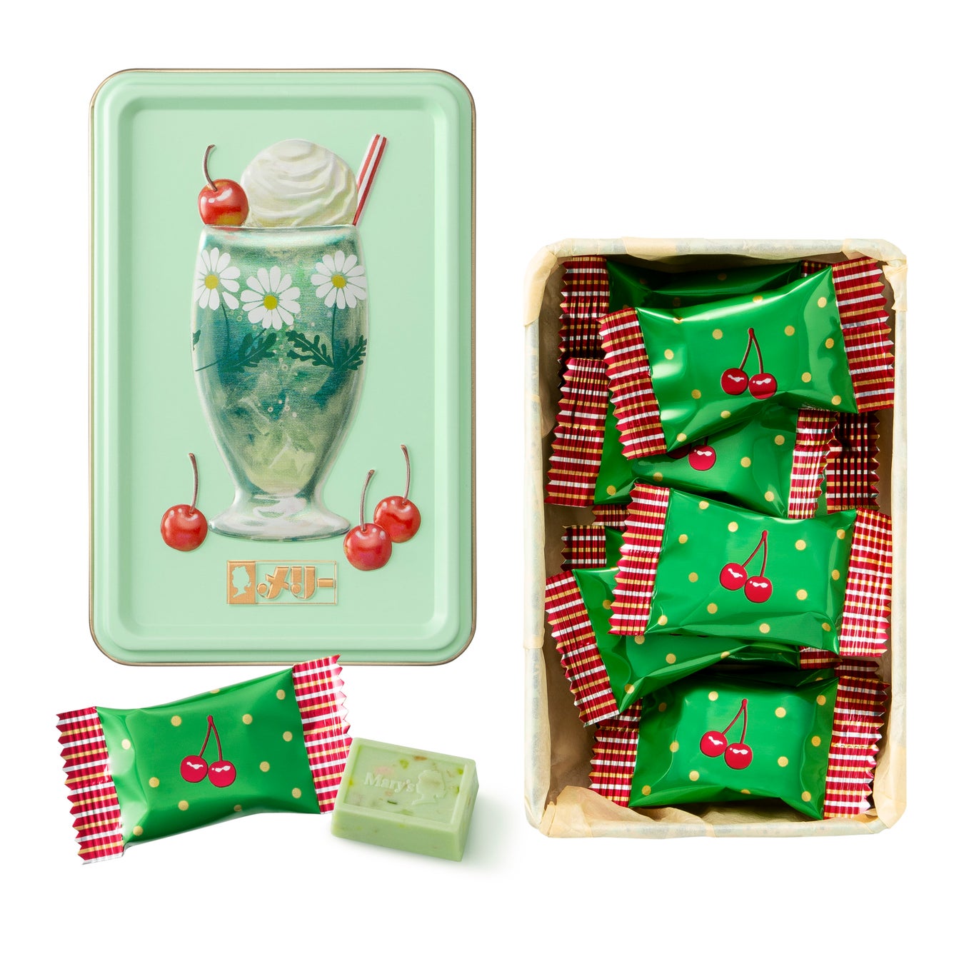 メリーチョコレートとアデリアレトロでは、2025年のコラボ企画をきっかけに復刻した「花だん」をはじめ、両社担当者が選んだ人気の「ズーメイト」、「花の輪」、「野ばな」の柄の台付きグラスをデザインした、4種類のはじけるキャンディチョコレート。の缶商品をご用意しました。