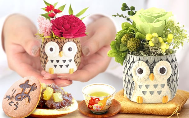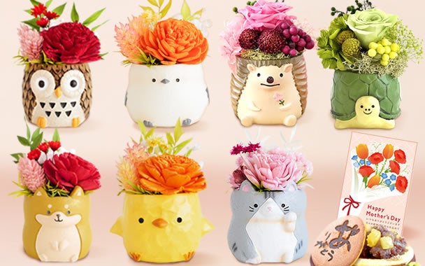 おいもやでは、定番の花とスイーツセットから、犬・猫好きのお母さんに向けたアニマルモチーフ、人気のキャラクターギフト、2026年の新商品まで幅広いプリザーブドフラワーを取り揃えています。