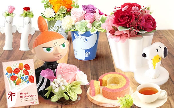 キャラクター系では、スヌーピーをあしらった白い陶器のプリザアレンジや、ムーミン、リトルミイ、スナフキンなどから選べる母の日向けギフトが展開されています。ムーミンシリーズではガラスドームや一輪挿しなどバリエーションもあり、“かわいい”だけでなくインテリア性も感じられます。
