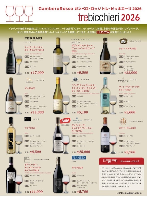 日欧商事株式会社(本社:東京都港区、代表取締役社長:Thierry Cohen(ティエリー・コーヘン) )が輸入販売するイタリアワイン11アイテムが、ガンベロロッソによる世界で最も権威あるイタリアワインのガイドブック『ヴィーニ・ディタリア(イタリアワインガイド)2026年度版』で、最高評価の「トレ・ビッキエーリ」(3グラス)を獲得しました。