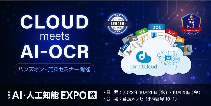法⼈向けクラウドストレージ「DirectCloud」の開発・販売を行う株式会社ダイレクトクラウド(本社:東京都港区、代表取締役:安 貞善)は、2022年10月26日(水)~10月28日(金)に幕張メッセで開催される「第3回 AI・人工知能EXPO【秋】」(小間番号:10−1)にブースを出展します。