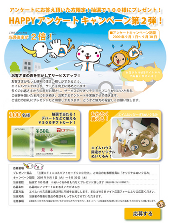なお、9月はアンケートキャンペーンとご来店キャンペーンを実施します。アンケートキャンペーンは先月に引き続き行うもので、アンケートにお答えいただいた方の中から、抽選で100名様に「三菱UFJニコスギフトカード」500円分をプレゼントします。抽選でもれた方にも当社キャラクターのぬいぐるみセットをもれなくプレゼントします。応募は「AIMHOUSE TIMES」に付いているハガキ、および当社のWEBサイトからできます。