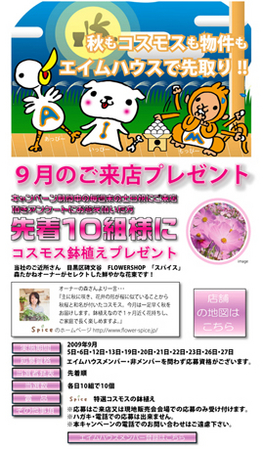ご来店キャンペーンでは、9月の土曜、日曜、祝日に来店されたお客さま先着10組の方に、秋桜の和名で知られるコスモスの鉢植えをプレゼントいたします。数に限りがございますので、ぜひお早めにお越しくださることをお勧めします。