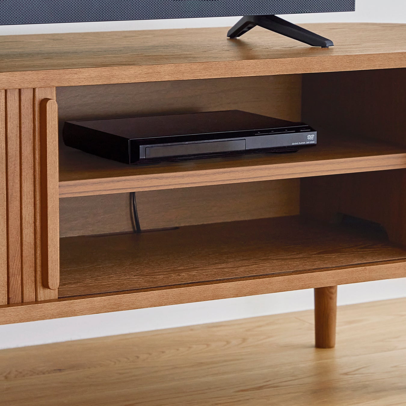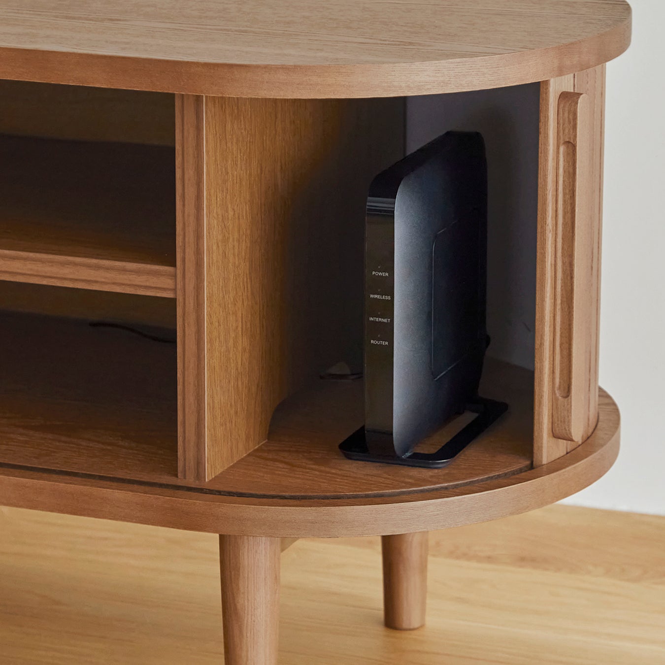 圧迫感を感じさせない、すっきりとした楕円形のデザインで、扉は場所をとらずに開閉ができる引き戸式。扉を開いた中央にある棚には、AV機器などをすっきりと収納できます。両端の収納スペースは、外から見えにくい収納場所として活用可能です。底板には、ケーブルを通せるコンセントホール付き。端の収納スペースにも配線を通せるようになっているため、電子機器などを目立たないように収納することもできます。