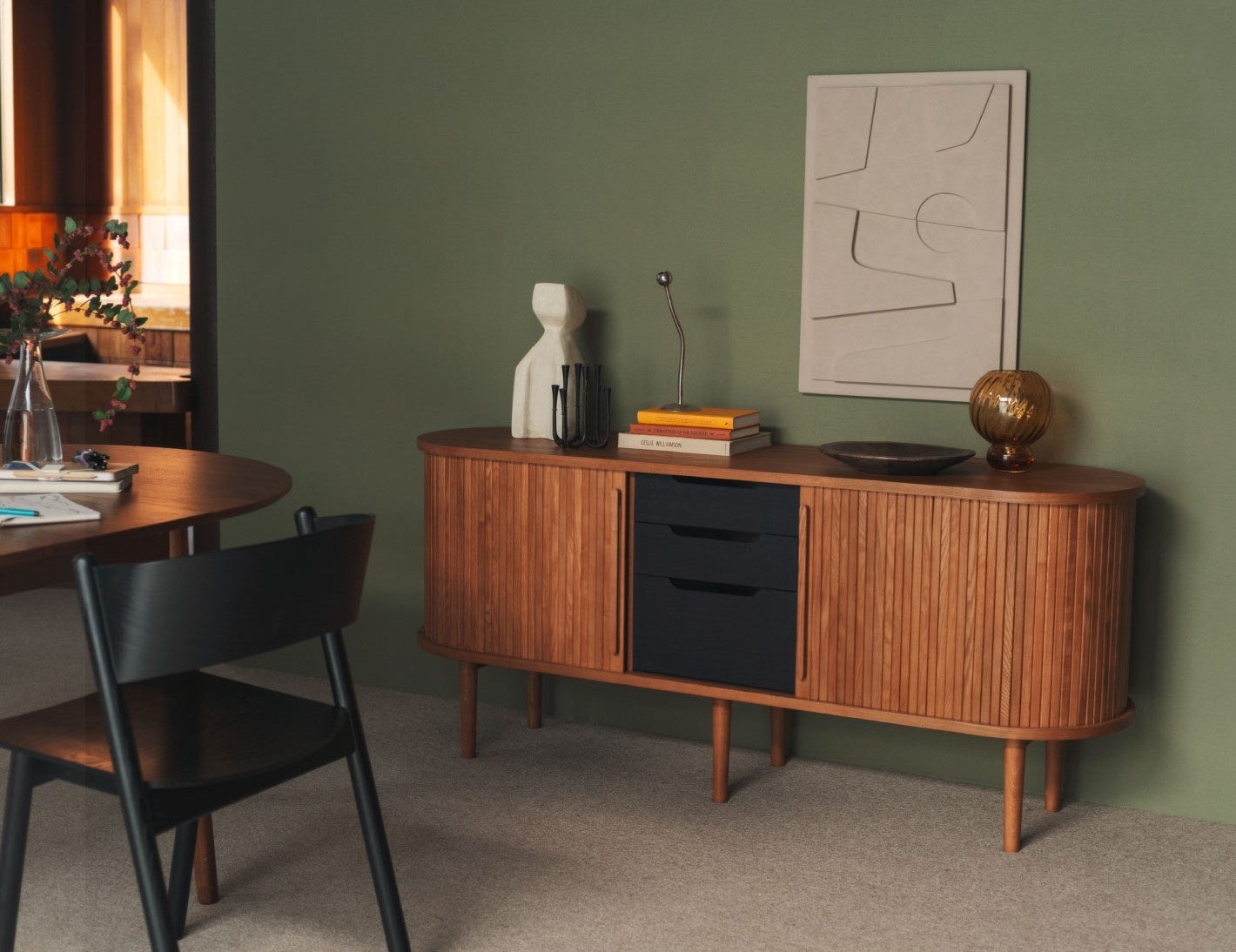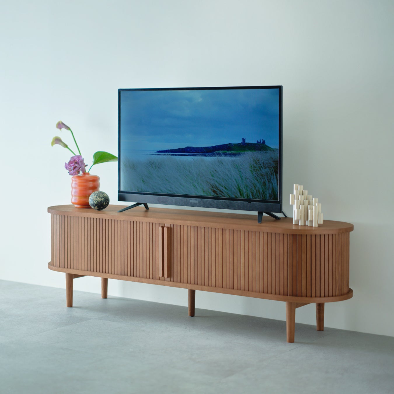 DEMIのキャビネットが好評であることを受け、同シリーズのTVボードを開発。ヴィンテージ感のある蛇腹式の扉が特徴の、アイコニックなTVボードです。