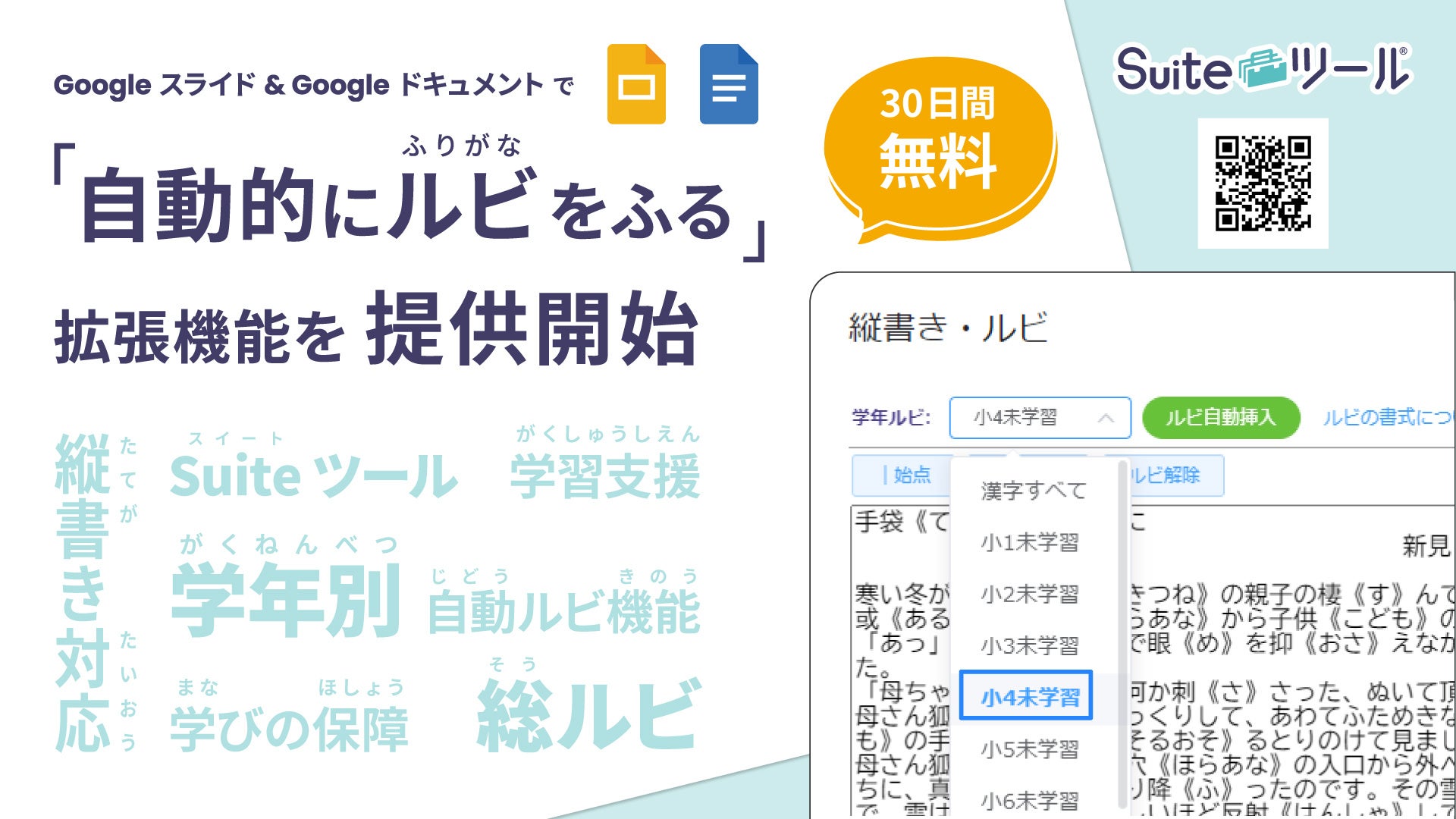 教育ICT用ソリューションを開発、提供するゼッタリンクス株式会社(本社:東京都荒川区、代表:山田 邦裕)は、Google スライド™ や Google ドキュメント™ で漢字に自動的にルビ(ふりがな)を振る機能を提供開始いたしました。漢字や熟語を読みやすくしたり、発音を表したりするルビを振ることで、多様なニーズに応じた文章を簡単に作成することができます。更に、教育機関向けの機能として指定学年までに習っていない漢字にだけ自動でルビを振ることも可能です。