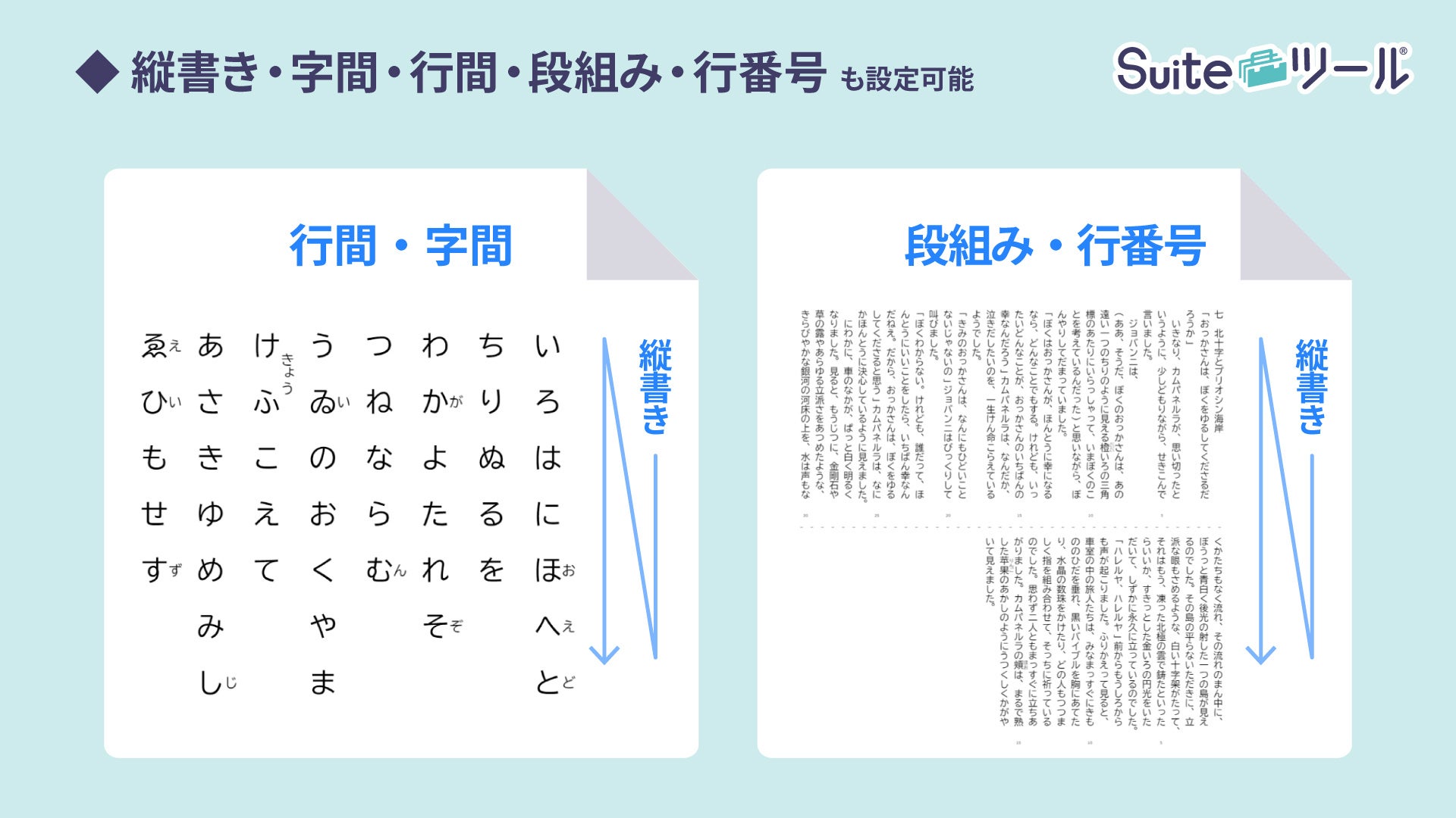 「Suiteツール」には、 Googleの標準機能にはない、日本語特有の「縦書き」への変換機能も搭載しています。行間、字間、段組み、行番号も設定できるので、短歌や俳句、漢文などの教材作成に行間・字間を用いたり、長文の内容理解度や読みやすさ向上のために段組みや行番号を用いたりしてご活用いただけます。ルビ付き文章も縦書きに変換することが可能です。