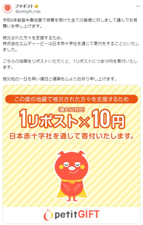 デジタルクーポン配信システム「プチギフト(R)」を提供する、株式会社エムディーピー (以下「MDP」、東京都港区、代表取締役:星田 洋伸)は、能登半島地震により被災された方々を支援するため、日本赤十字社を通じて寄付をすることにいたしました。こちらの投稿をリポストいただくと、1リポストにつき10円を全額寄付します。