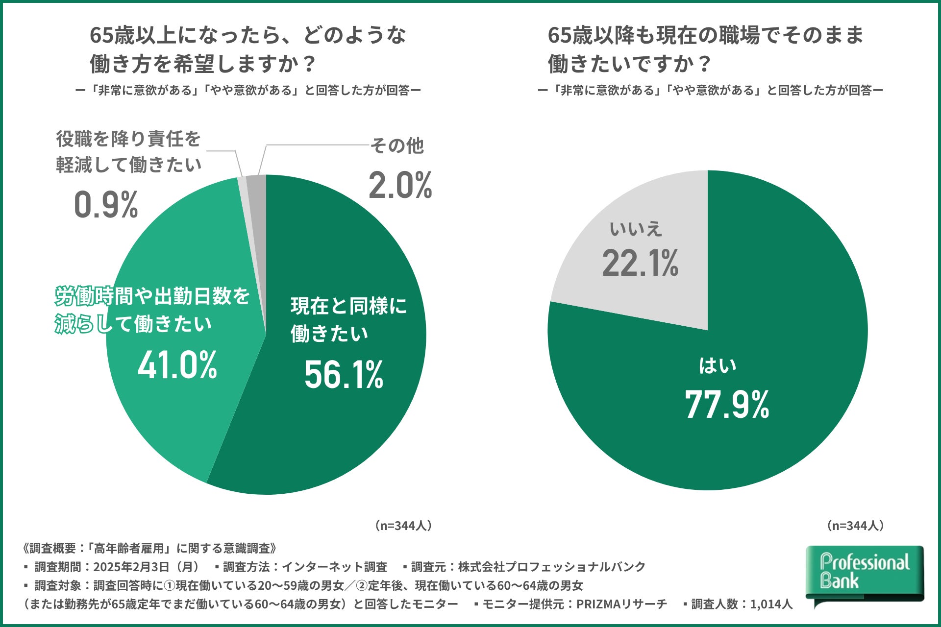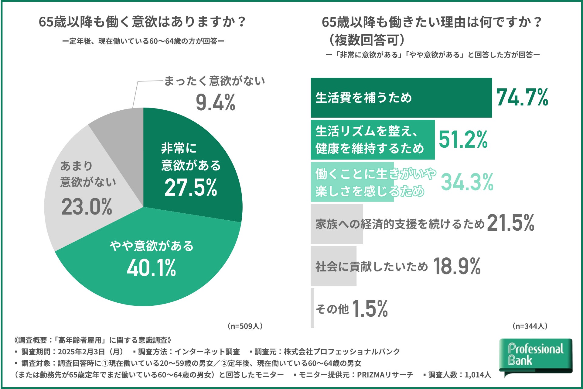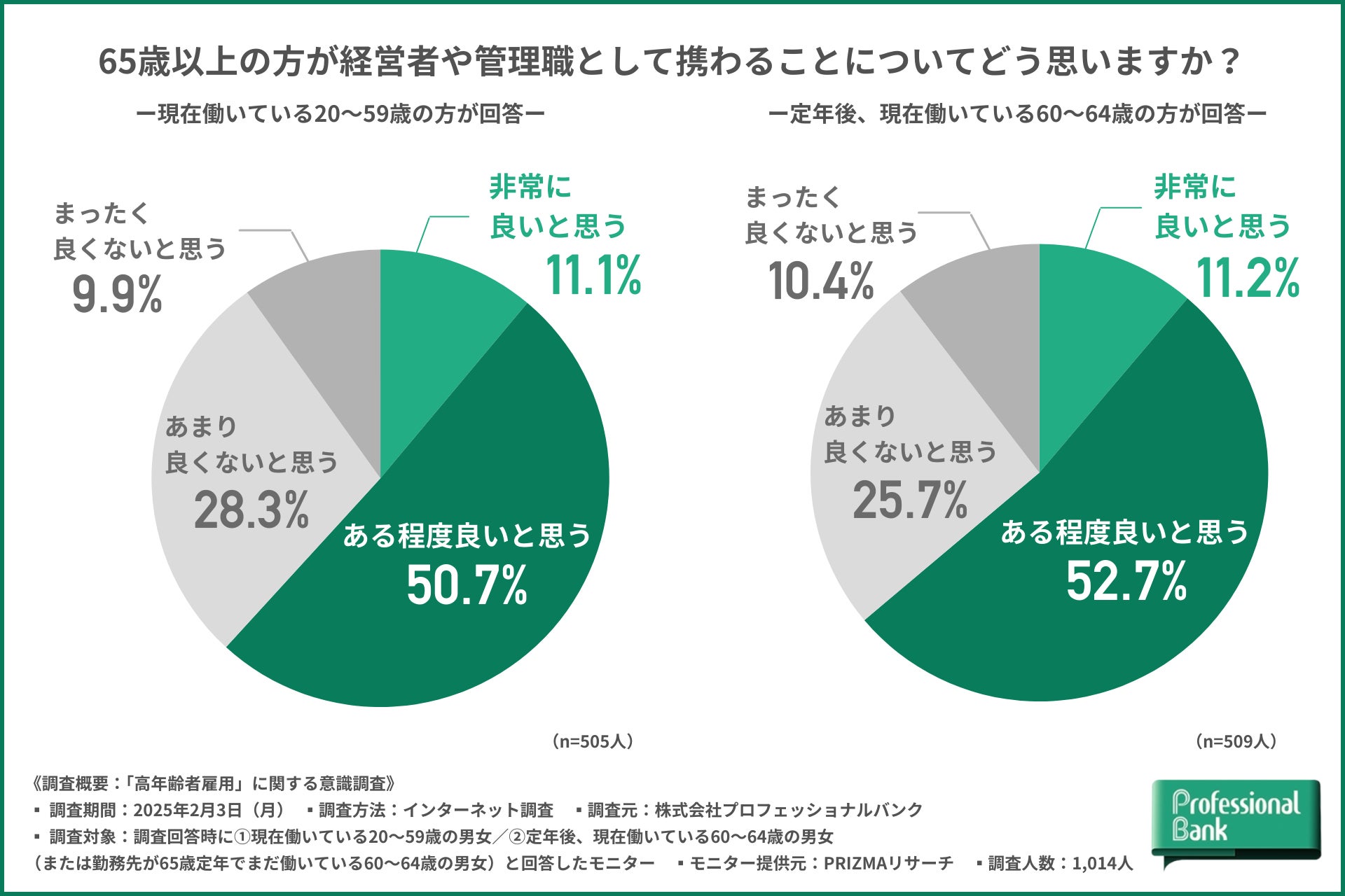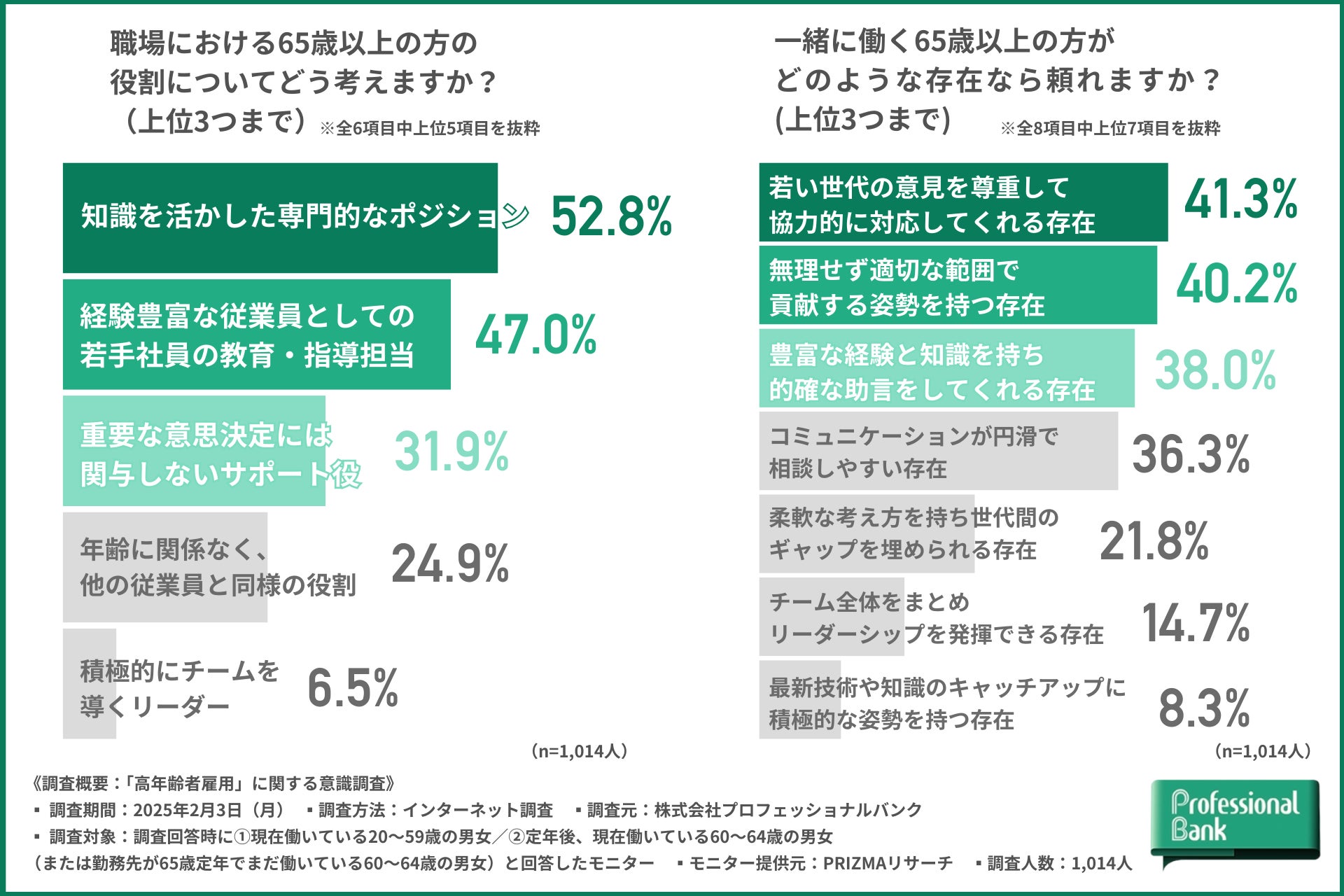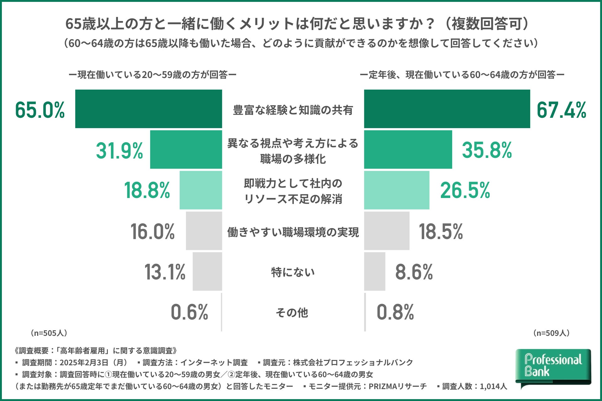 株式会社プロフェッショナルバンク(本社:東京都千代田区、代表取締役社長:呑田 好和)のHR研究所は、2025年4月【高年齢者雇用安定法の改正】を前に、①現在働いている20~59歳の男女/②定年後(または勤務先が65歳定年)も働いている60~64歳の男女を対象に、「高年齢者雇用」に関する意識調査を実施しました(有効回答数:1,014人)。