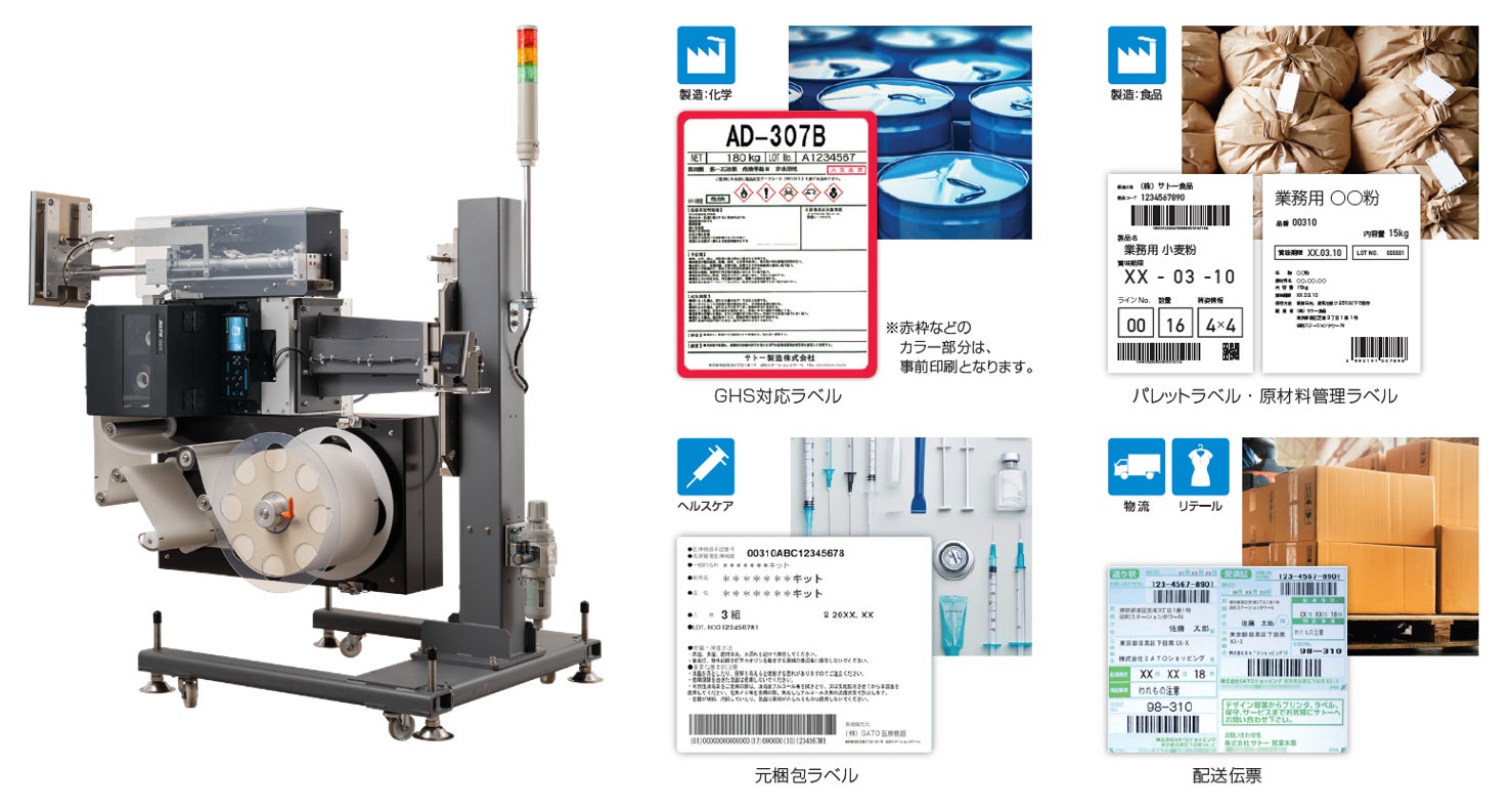 本商品は、サトーがさまざまな業界のお客さまの現場課題と向き合い、ノウハウを結集した汎用モデルとして開発しています。導入による製造ラインの変更を最小限に抑えることが可能で、製造ラインの流れやラベルの貼り付け方式、設置方向を選択することができます。化学品や医薬品、食品などの製造業界や物流業界など、あらゆる業界のラベル貼り付け作業の効率化と、品質向上に貢献します。
