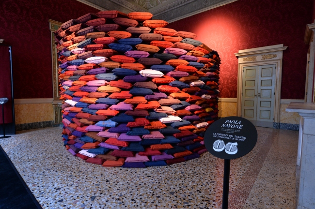 パオラ・ナヴォーネの「La fortezza del silenzio(沈黙の砦)」は外見はミニサイズの要塞のようですが、素材の壁によってひそやかな瞑想のスペースを作り出し、アルカンターラ素材の音響効果を強調しています。素材にはグラデーションの色が使われ、多数のぜいたくな調度品の古風な綾織とみごとに調和する能力を鮮やかに見せています。