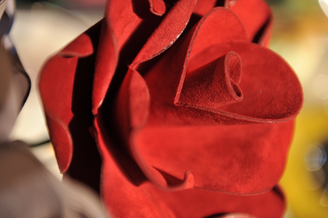 イーコ・ミリオーレとマーラ・セルベットのインスタレーション作品は、昔の王宮で使われていた舞台装置に似ています。この作品「Cromofono(クロモフォン)」は大きな輪の形をしており、動きによって色彩、テクスチャ、音のシンフォニーを奏で、アルカンターラ素材の多彩な特性を強調しています。さらにグラフィック・アーティスト、イタロ・ルピ(Italo Lupi)の参加によって全体の効果に特別な美しさが加わりました。