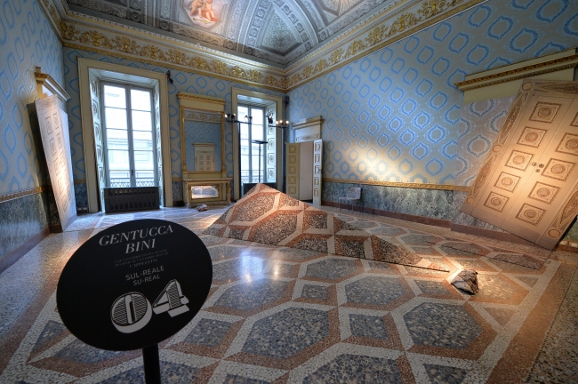 ジェントゥッカ・ビニの作品のヒントとなったのは、王宮の内装材の壮麗な装飾性でした。「Sul-reale(王宮にて)」と題した作品において、有名なスタイリスト/デザイナーであるビニは空間を区切って、アルカンターラのフォトプリンティングの演出により、視覚的イリュージョンの舞台に変えています。
