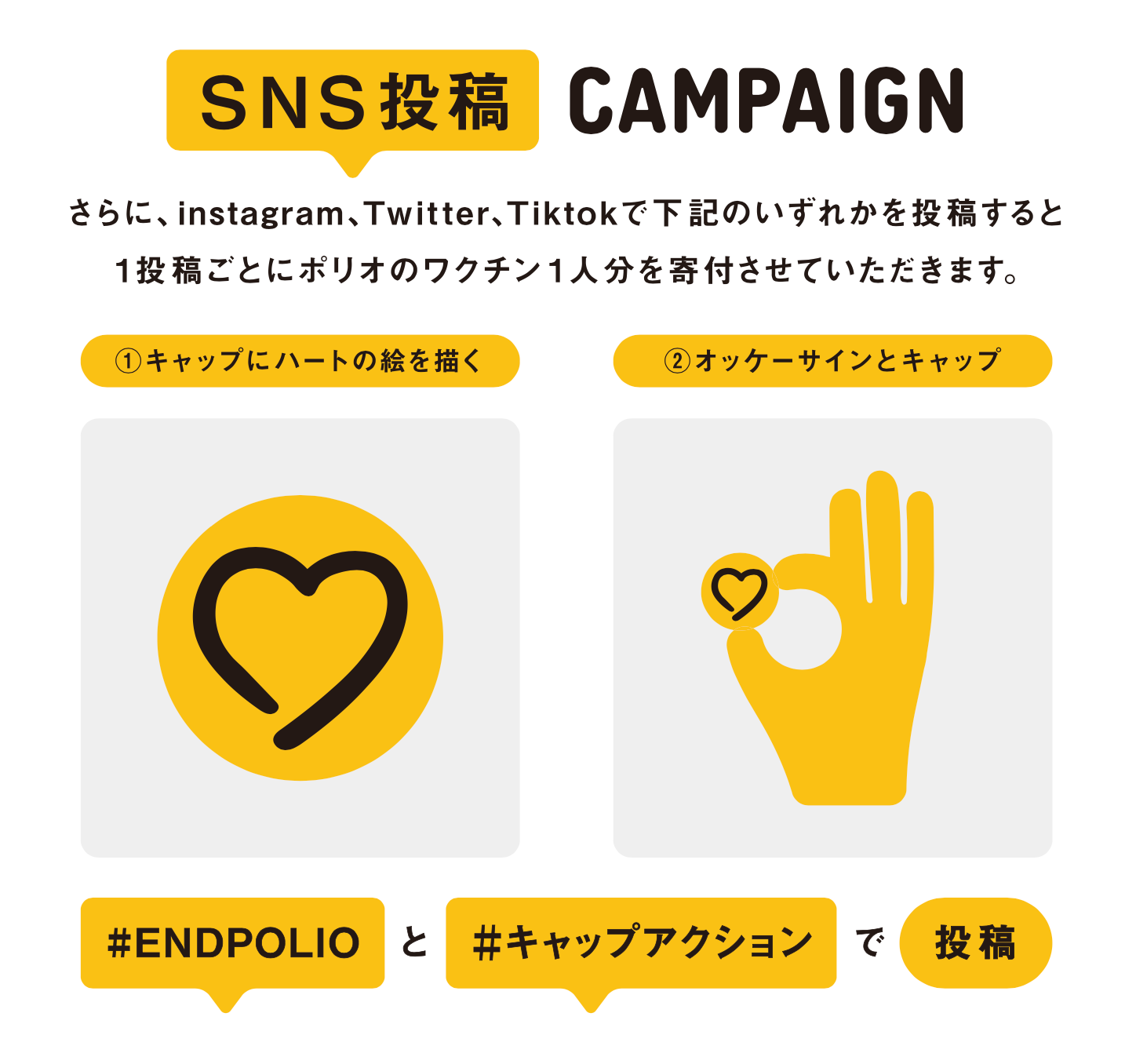 プロジェクト期間中にSNS(Instagram/Twitter/TikTok)で特定の写真やハッシュタグで投稿することで、1投稿につき1人分のポリオワクチンが寄付されるキャンペーンも展開します。