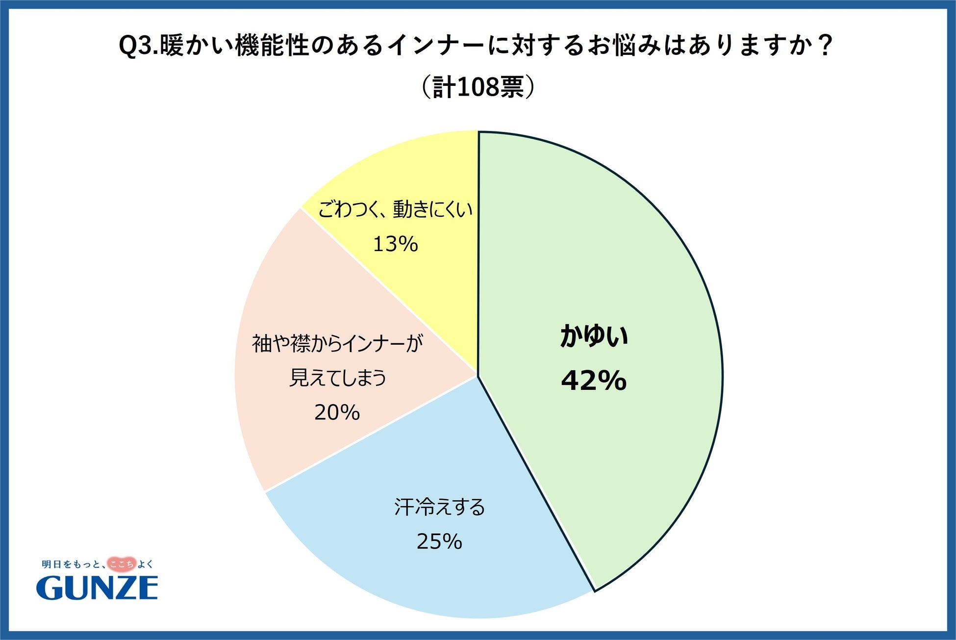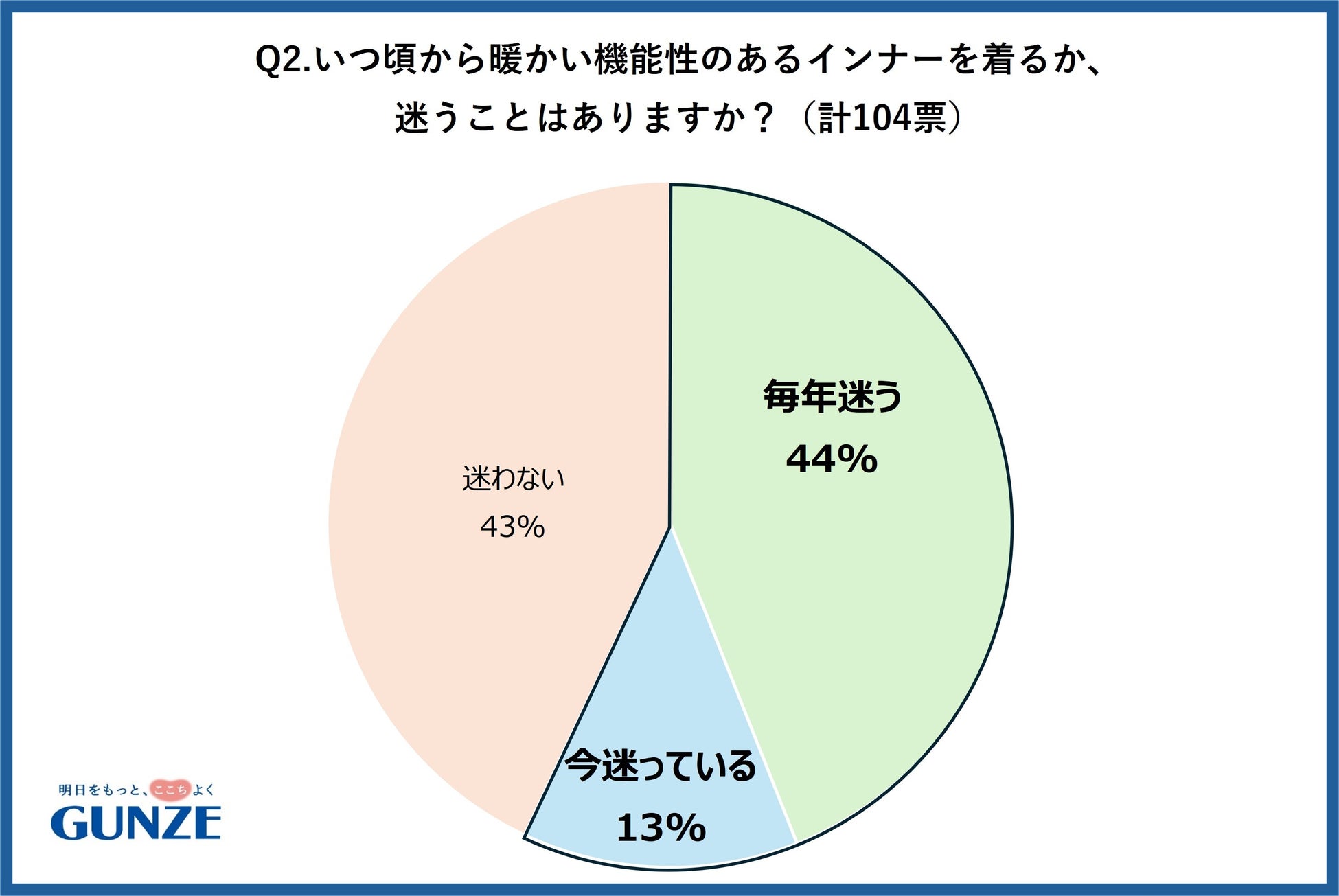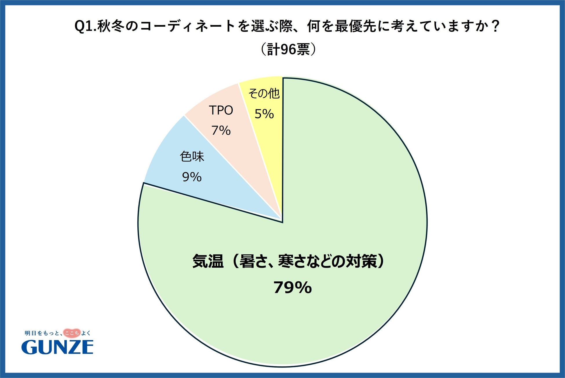 グンゼの公式Xを使用し、秋冬に着用するインナーについてのアンケート調査を行いました。「秋冬のコーディネートを選ぶ際、何を最優先に考えていますか?」という質問に対しては、『気温』と答えた人が79%でした。しかし、いつ頃から暖かいインナーを着るか、『毎年迷う・今迷っている』方は合計57%と、気温によって対策をしながらコーディネートを選びたいのに、タイミングが分からず迷う人が多いようです。 また、暖かいインナーに対するお悩みに関しては、『かゆい』が42%。次いで『汗冷えする』や『袖や襟から見えてしまう』といった回答もそれぞれ20%以上あり、気温に対する悩みだけでなく様々なインナー悩みがあることが分かりました。