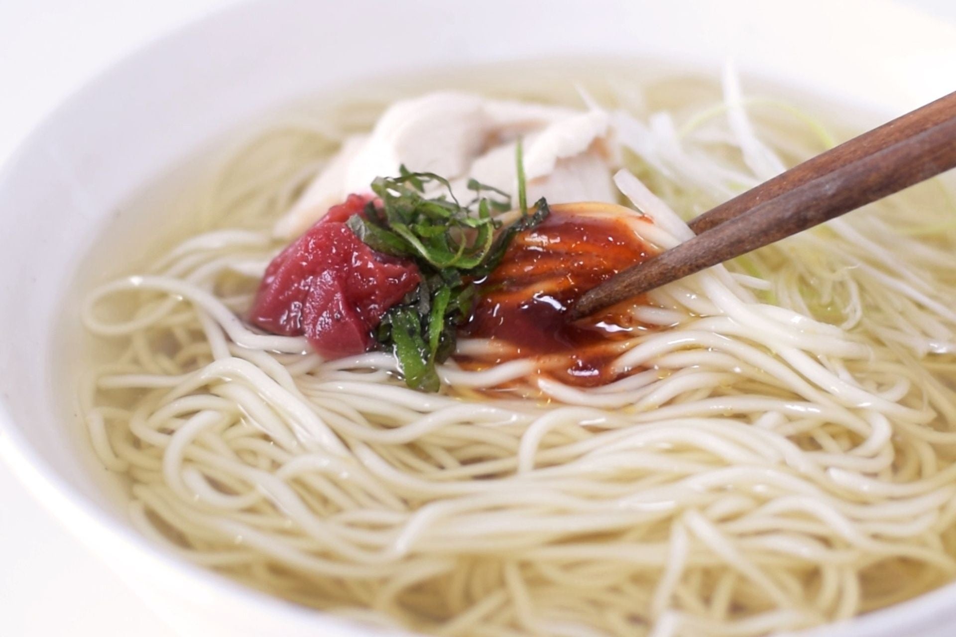 梅の爽やかな風味が特長のラーメンです。スープは鰹・昆布・いりこをふんだんに使用しており、「梅の爽やかな風味」と「旨味たっぷりな鰹出汁」のバランスにこだわりました。モチモチ食感の特製生麺との相性も抜群で、温かくしても冷やしても美味しくお召し上がりいただけます。特に冷やしは梅の風味が際立ち、夏の食欲が落ちやすい時期にぴったりの一品です。