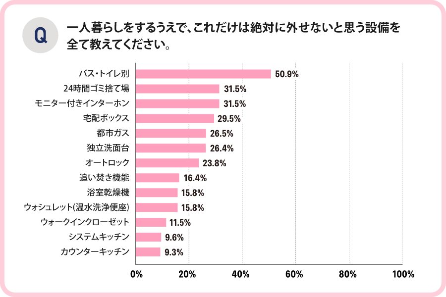 一人暮らしをする上で外せない設備の第1位は「バス・トイレ別」