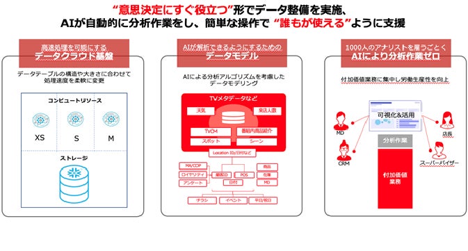 本連携により、小売企業やメーカー企業がもつ来店人数/POS/行動履歴データ等の1st Partyデータとテレビ局で放送されたTV番組やTV-CMをテキスト化・データベース化したTVメタデータをSnowflakeデータクラウド基盤上で高速に統合し、新世代BI Store360 Insightで分析できるようになります。