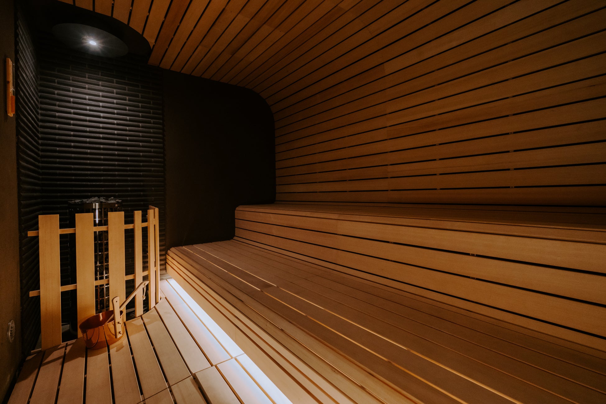 瞑想空間を演出するために、照明の明るさは極力抑え、ベンチや天井は曲線的なデザインに。上品ななかにも柔らかさを加えたサウナ空間になりました。サウナストーブは、世界シェアNo.1の"HARVIA(ハルビア)"社製のものを導入。セルフでロウリュ可能な本格派のフィンランド式サウナです。サウナの標準温度は80〜90℃に設定しております。
