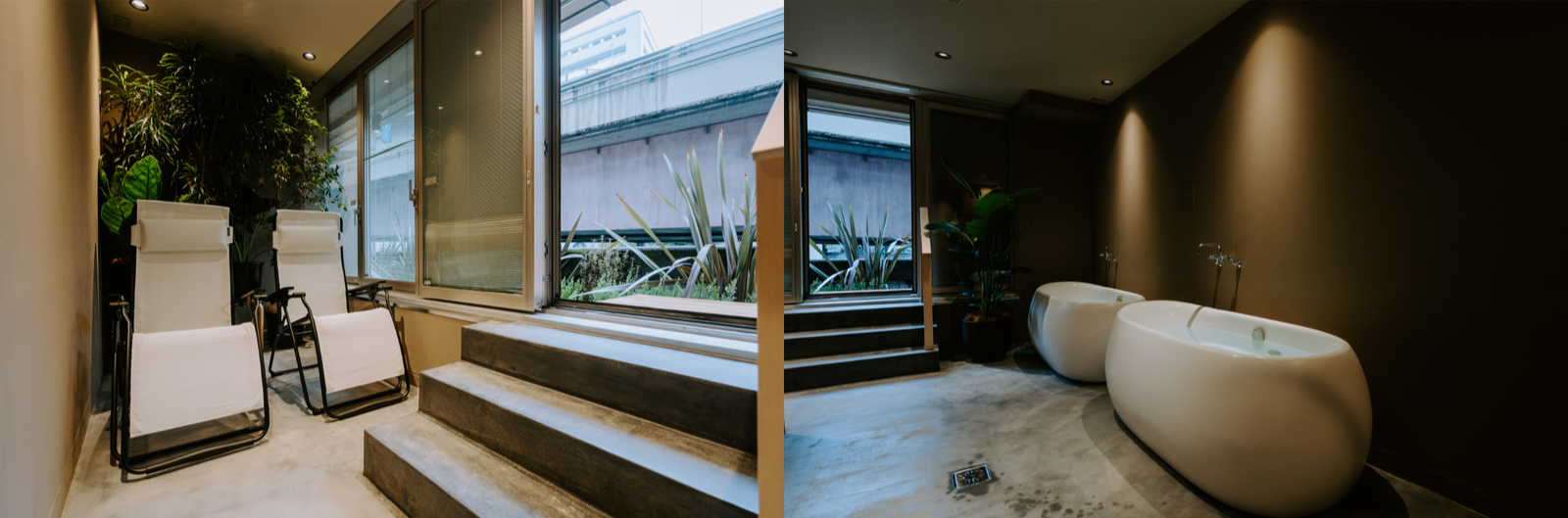 ゆったり浸かっていただけるよう、お1人用の水風呂を2つ設置しました。水風呂の水温は17度程度で、ととのいスペースにはサウナーに人気のLafumaのリクライニングチェアを2脚ご用意しています。また、目や耳からもリラックスして頂けるように観葉植物を置き、環境音を流しています