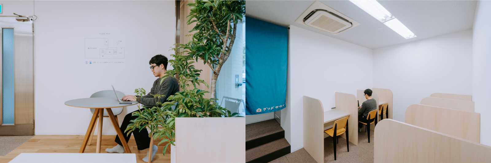サウナやアウトプットスペースでのリラックス後は、半個室型またはオープンスペースの2タイプが使えるラウンジで再び仕事に集中することができます。Wi-Fi・電源は完備しており、コーヒーとお水のドリンクサービスもご利用可能です。マンスリー会員の方は、全国に12箇所あるgoodofficeも使い放題となります。