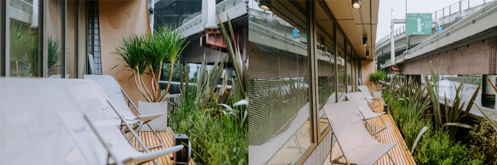 都心部では珍しい、屋外デッキもご用意いたしました。東京らしく首都高の目の前に位置しており、可能な限りゆったりとした空間を担保しています。こちらもLafumaのデッキチェアとオットマンを設置しており、外気浴をしながらお好きなだけ寛いで頂けます。