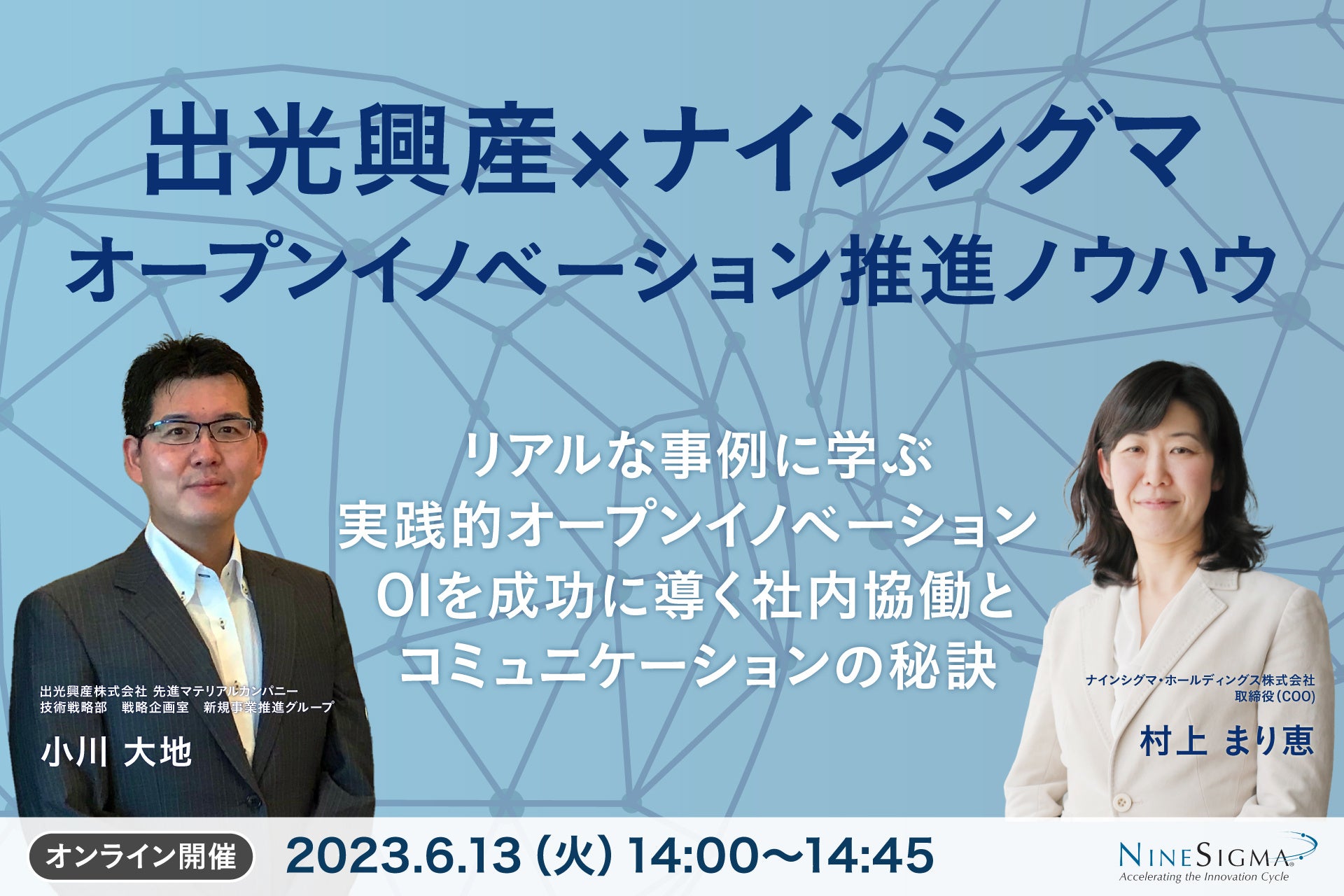 ナインシグマ・ホールディングス株式会社(本社:東京都千代田区、代表取締役社長:諏訪 暁彦、以下「ナインシグマ」)は、「外部知見・技術」の活用で事業・研究開発を推進する「オープンイノベーション」の組織的な推進について、以前よりご支援させていただいている出光興産株式会社様(本社:東京都千代田区、代表取締役社長:木藤 俊一、以下「出光興産様」)をお迎えし、「リアルな事例に学ぶ実践的オープンイノベーション推進セミナー:OIを成功に導く社内協働とコミュニケーションの秘訣」と題した無料オンラインセミナーを2023年6月13日に開催いたします。組織におけるオープンイノベーション推進の体制やカルチャー構築について、推進の主導者による超実践的なノウハウをお話いただきます。本日より参加登録を開始いたしますのでお知らせします。