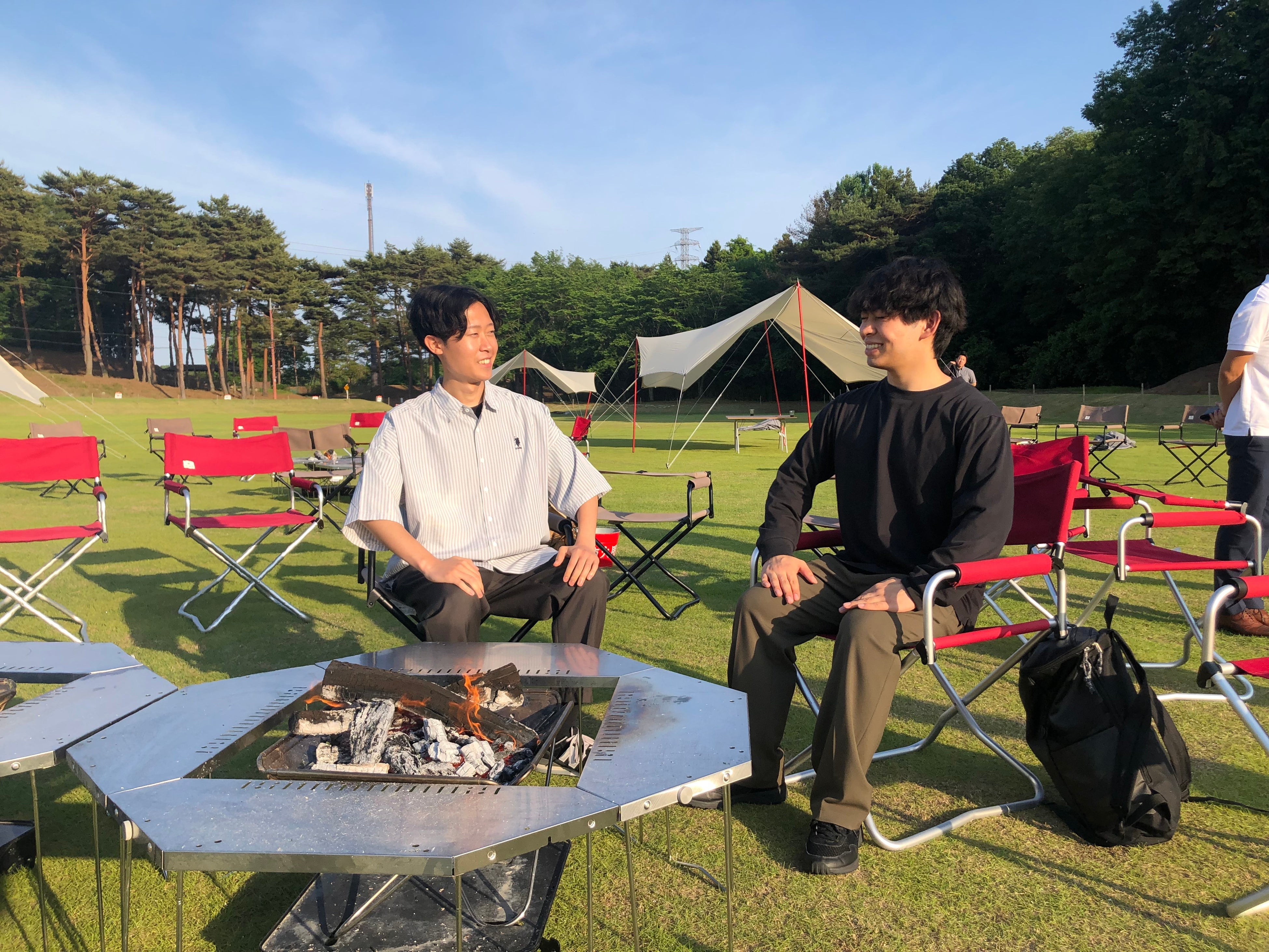 5月16日、「キャンピングオフィス」の体験会に弊社社員4人が参加しました。今回のキャンピングオフィス体験会は、森ビルゴルフリゾート株式会社が運営する宿泊施設「静ヒルズホテル」(茨城県常陸大宮市・那珂市)でスノーピークビジネスソリューションズと提携して行っているプログラムです。自然に囲まれたゴルフ場という開放感溢れる環境に身を置くことで、自由な発想でクリエイティビティの向上を図り、共同作業・共同体験を通じてチームの絆を深めることを目的としています。今回の体験会では、一緒に参加した他企業と静ヒルズの各施設を見学後、屋外でテントを設営し、焚火を囲んで語り合いました。社員からは「普段のオフィスワークでは接する機会のない人と話すきっかけになった」と喜びの声が聞かれました。