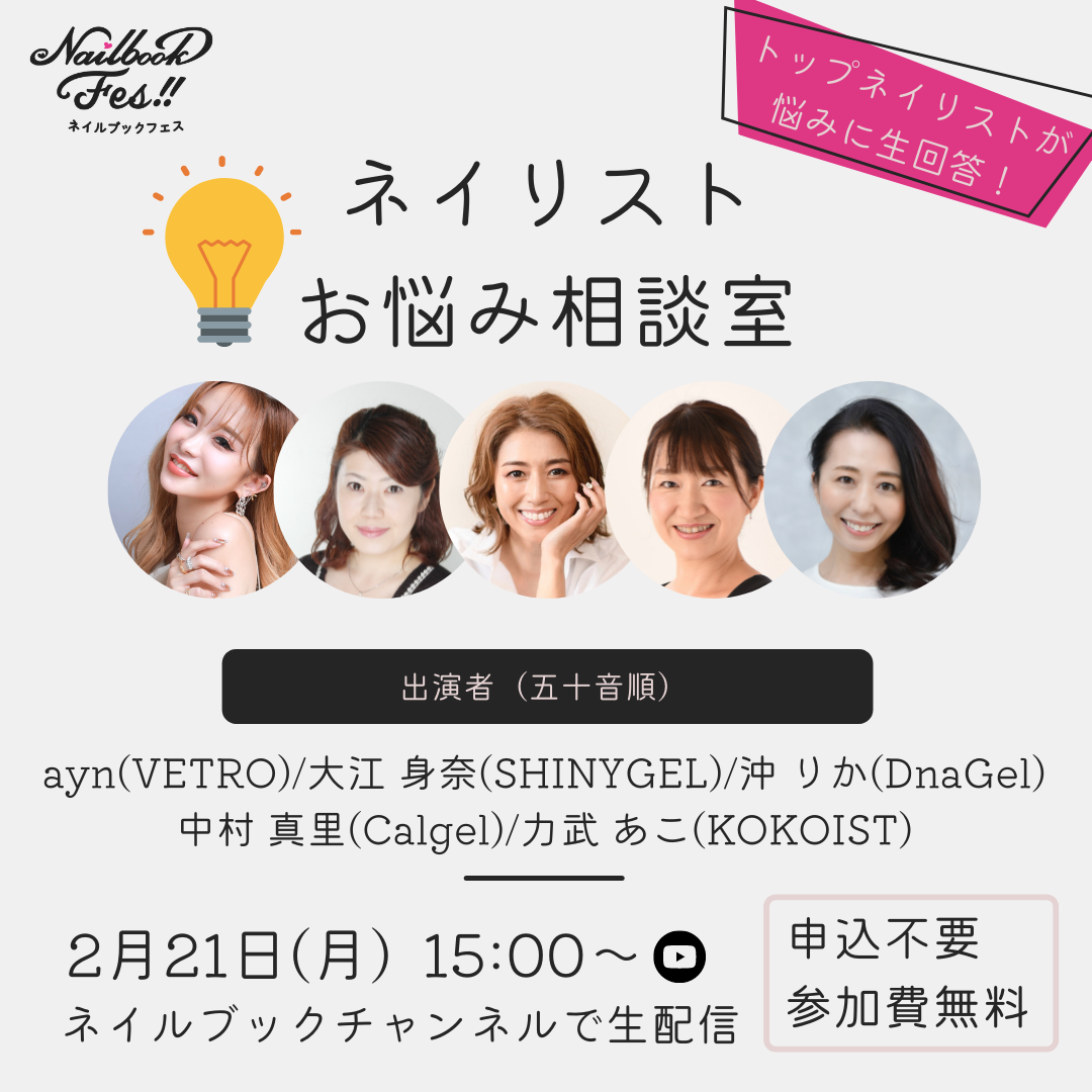 ネイルブックユーザーに事前アンケートを実施。集まったお悩みに、現役のサロンオーナーやジェルネイルを知り尽くしたメーカー教員担当さんなどバラエティー豊かな面々が生回答します♪