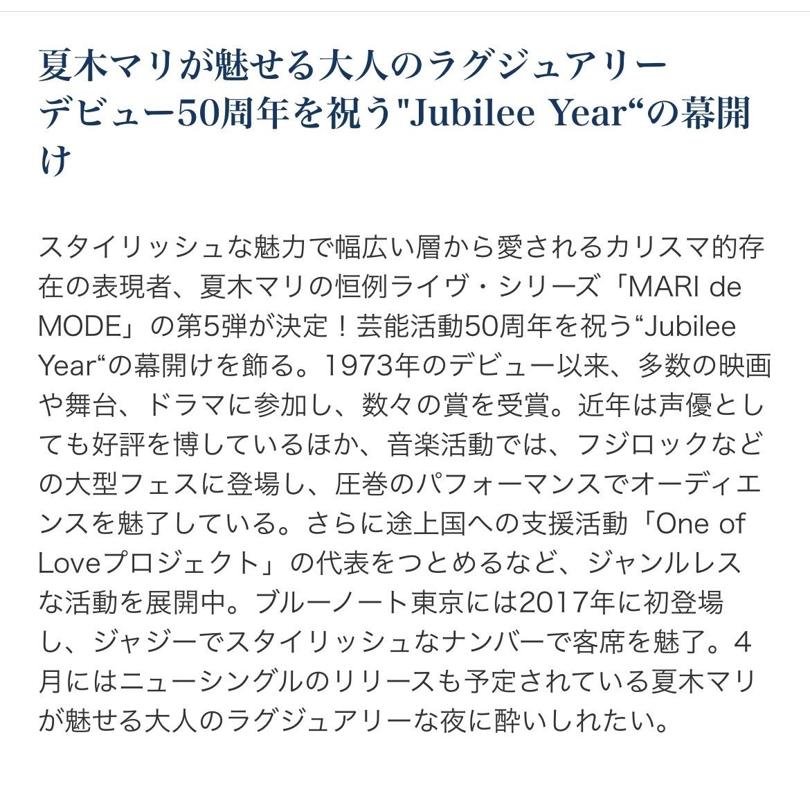 スタイリッシュな魅力で幅広い層から愛されるカリスマ的存在の表現者、夏木マリの恒例ライヴ・シリーズ「MARI de MODE」の第5弾が決定!芸能活動50周年を祝う“Jubilee Year“の幕開けを飾る。1973年のデビュー以来、多数の映画や舞台、ドラマに参加し、数々の賞を受賞。近年は声優としても好評を博しているほか、音楽活動では、フジロックなどの大型フェスに登場し、圧巻のパフォーマンスでオーディエンスを魅了している。さらに途上国への支援活動「One of Loveプロジェクト」の代表をつとめるなど、ジャンルレスな活動を展開中。ブルーノート東京には2017年に初登場し、ジャジーでスタイリッシュなナンバーで客席を魅了。4月にはニューシングルのリリースも予定されている夏木マリが魅せる大人のラグジュアリーな夜に酔いしれたい。