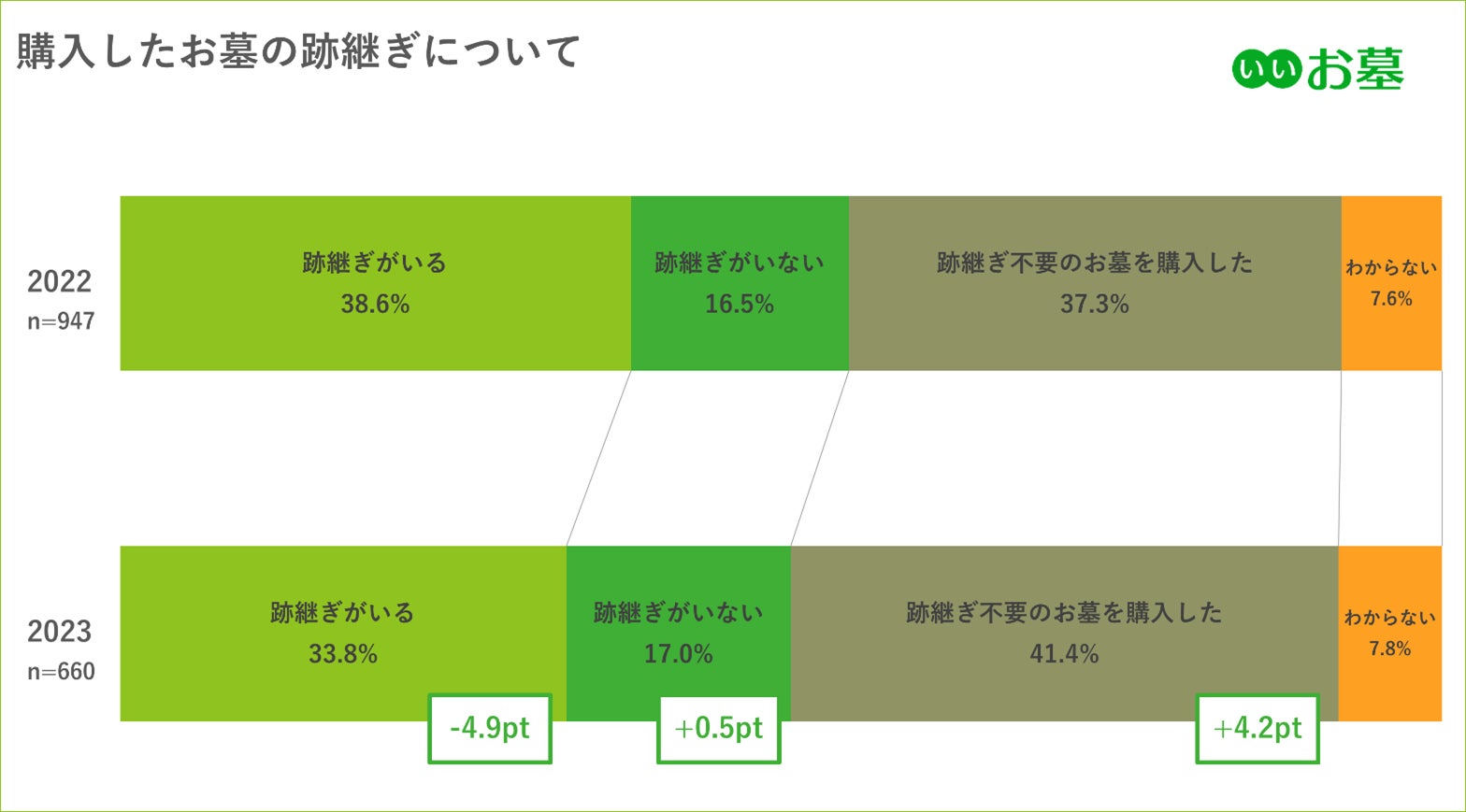 株式会社鎌倉新書が運営する「いいお墓」が2023年3月におこなった調査によると、購入したお墓の種類に関して、一般墓を購入した方は全体の19.1%に留まり、残りの約8割の方は「樹木葬」や「納骨堂」を選んだという結果が出ています。また、購入したお墓の跡継ぎについての質問では、「跡継ぎ不要のお墓を購入した」という回答が前年に比べて+4.1%上昇しており、次いで「後継ぎがいない」方が+0.5%、「後継ぎがいる」方が▲4.8%と「継承者が不要」なタイプのお墓に注目が集まっていることが分かりました。