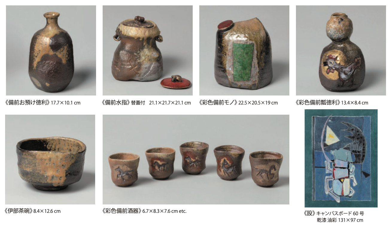 本展では、加島美術にて開催する安倍安人の個展としては初となる、茶事において亭主の代役を務め、客同士の語らいをもたらす道具「お預け徳利」を出品いたします。また桃山古備前への深い洞察に基づく水指・花入・茶碗・扁壷・徳利・酒器といった備前焼・伊部焼を出品するほか、ユニークな彫り模様とあざやかな彩色が織りなす「彩色備前」や、今年の干支にちなみ、馬を描いた彩色の酒器も発表いたします。作家活動の原点である油彩画を含めた48点。桃山古備前の風格漂う簡古質朴な造形と唯一無二の彩色が共存する作品群を通して、古典の本質を踏まえた表現の深化をご覧いただきます。