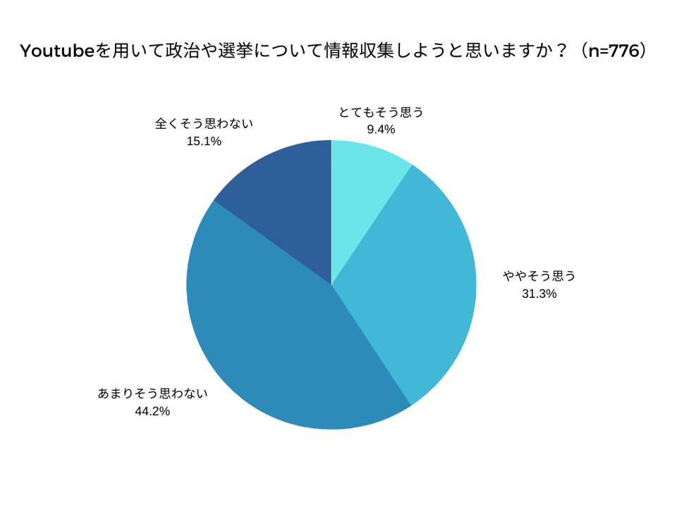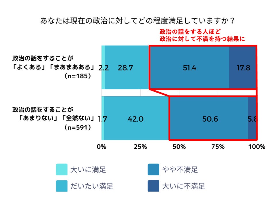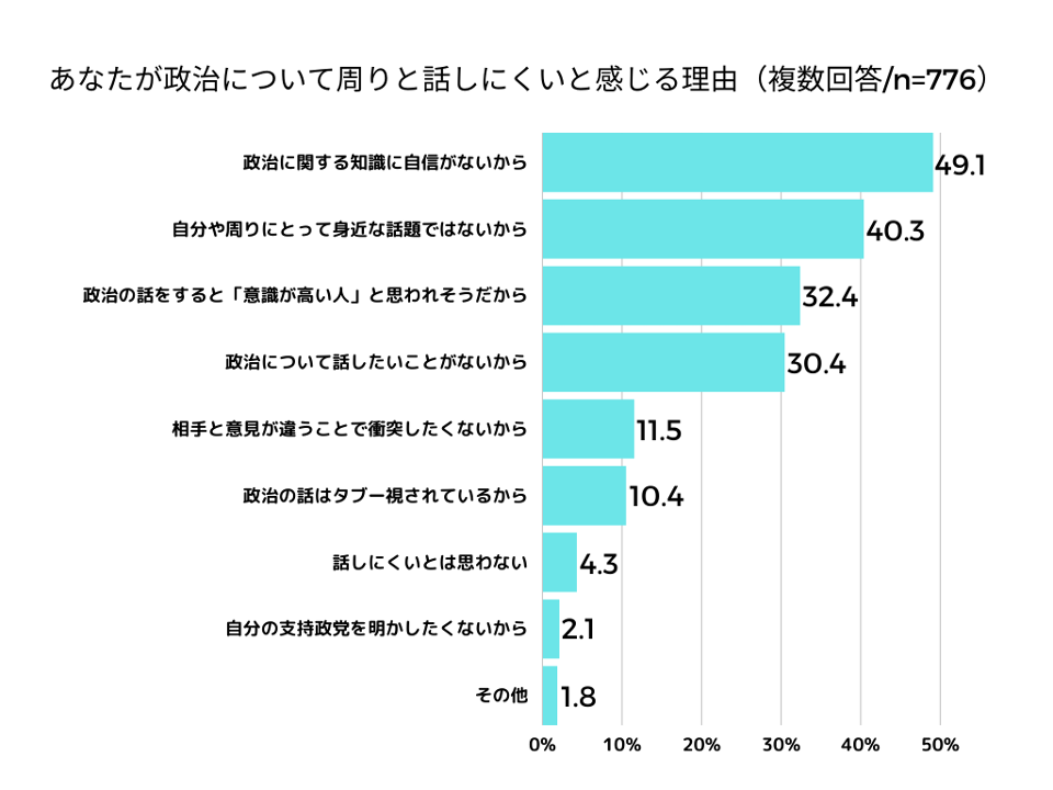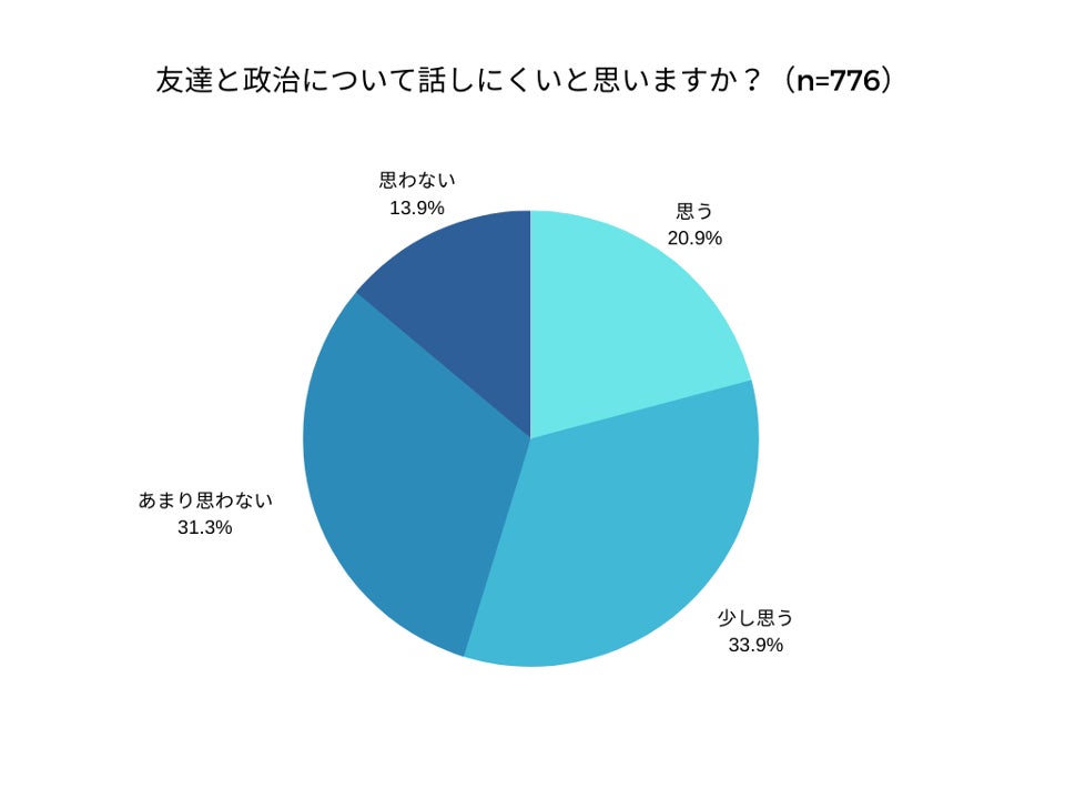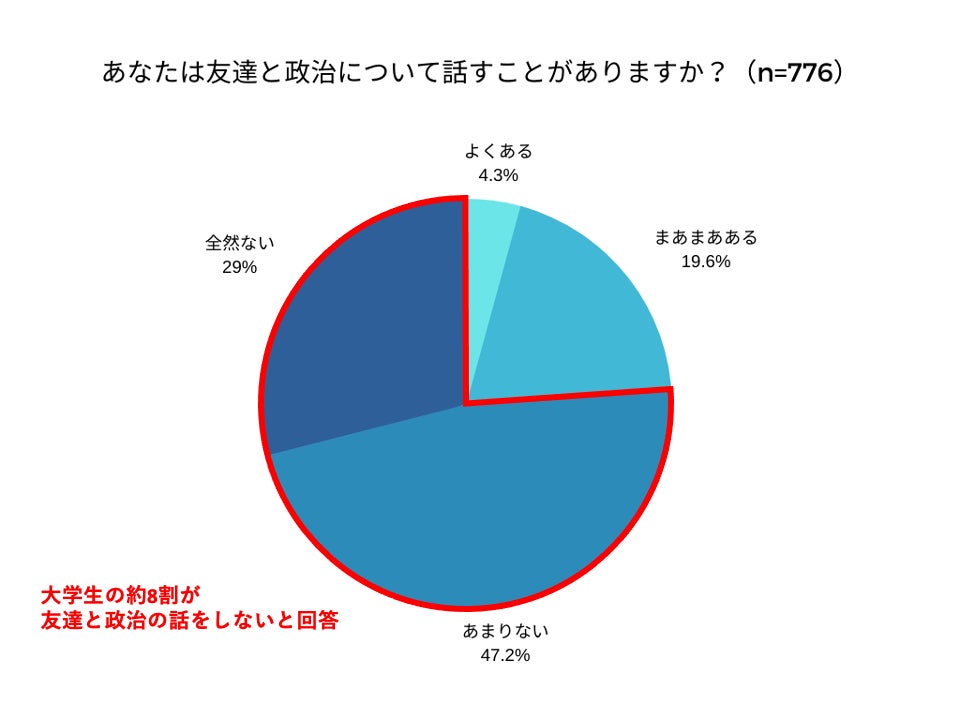 「あなたは、友達と政治について話すことがありますか?」と尋ねたところ、「よくある」が4.3%、「まあまあある」が19.6%、「あまりない」が47.2%、「全然ない」が29.0%と回答し、約8割(76.2%)が政治の話を友達と話さないことが判明した。