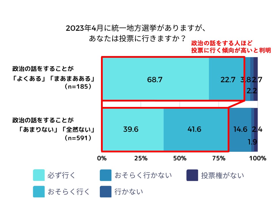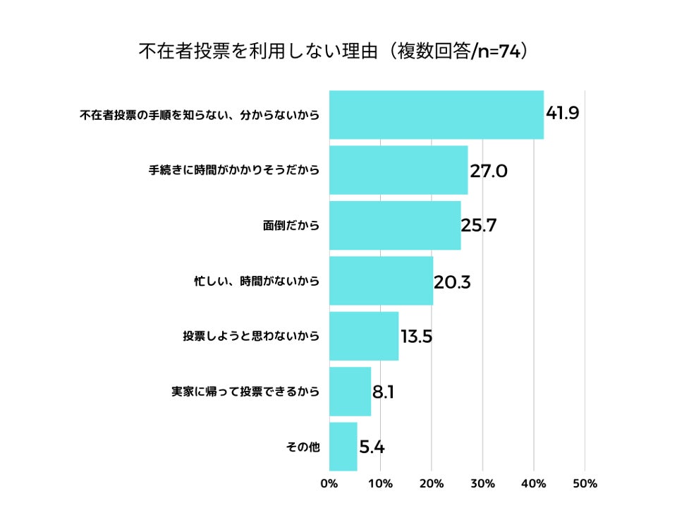 今回の調査では、多くのZ世代が4月の統一地方選挙で投票に行こうとしている一方、1人暮らしのZ世代の約6割が居住地に住民票がないこと、4割以上の人が不在者投票を認知していないことが分かり、Z世代における投票へのハードルの高さが明らかとなりました。特に、この3、4月は進学を機に引っ越しをするZ世代も多くなることから、仕組の理解やより一層、政治や選挙に関心を持つきっかけを作ることが重要であると考えます。
