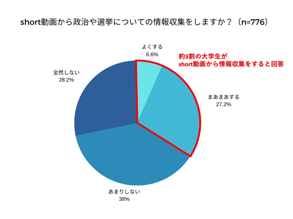 8割以上の⼤学⽣が4⽉の統⼀地⽅選挙で投票に⾏くと回答するも⼤学⽣の4⼈に1⼈が居住地に住⺠票を移しておらず、 4割以上が不在者投票を認知していないことが判明した。また、⼤学⽣の約8割が友達と政治の話をせず、半数以上が政 治の話に抵抗を感じていることがわかり、選挙情報の収集⽅法も「SNS」や「YouTube」、「short動画」がほとんどと いう事もわかった。