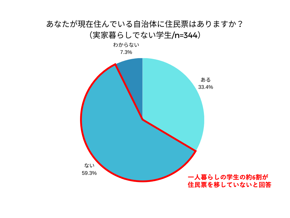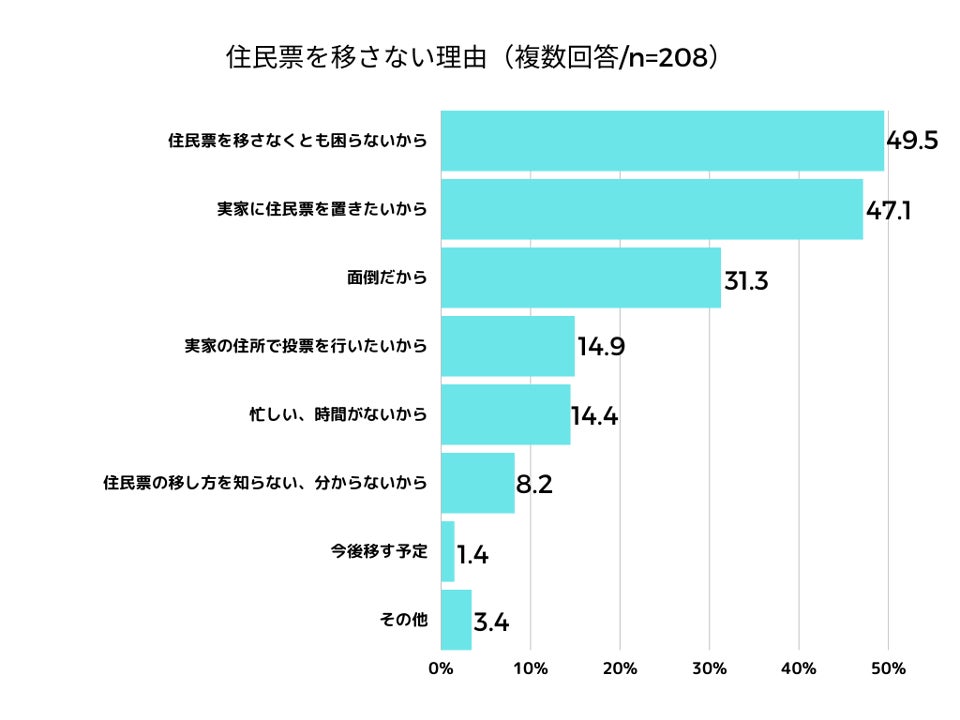「あなたが現在住んでいる⾃治体に住⺠票はありますか?」と尋ねたところ、「ある」が66.1%、「ない」が26.8%、「 わからない」が7.1%となった。さらに、実家暮らしでない⼤学⽣に限定した場合(n=344)、「ある」が33.4%、「な い」が59.3%、「わからない」が7.3%となり、⼀⼈暮らしの⼤学⽣の約6割(59.3%)が住⺠票を移していないことが 判明した。また、前問で「現在住んでいる⾃治体に住⺠票がない」(n=208)と回答した学⽣にその理由を尋ねたとこ ろ、「実家に住⺠票を置きたいから」が49.5%、「住⺠票を移さなくとも困らないから」が47.1%、「⾯倒だから」が3 1.3%、「実家の住所で投票を⾏いたいから」が14.9%、「忙しい、時間がないから」が14.4%、などが上位になった。