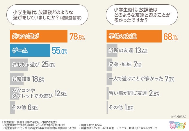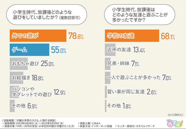 「小学生時代、放課後どのような遊びをしていましたか?(複数回答可)」と質問したところ、『外での遊び(78.8%)』と回答した方が最も多く、次いで『ゲーム(55.0%)』『おもちゃ遊び(25.0%)』と続きました。