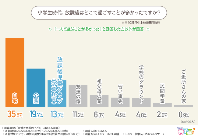 『一人で遊ぶことが多かった』以外を選択した方に、「小学校時代、放課後はどこで過ごすことが多かったですか?」と質問したところ、『自宅(35.6%)』と回答した方が最も多く、次いで『公園(19.7%)』『放課後児童クラブ(学童保育)(13.7%)』と続きました。