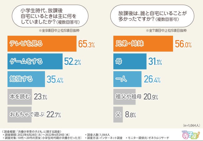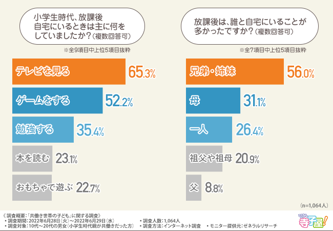 そこで今回、アフタースクール寺子屋(https://schoolterakoya.tokyo/)を運営する株式会社青月社は、10代~20代の男女(小学生時代共働きだった方)を対象に、「共働き世帯の子ども」に関する調査を実施しました。