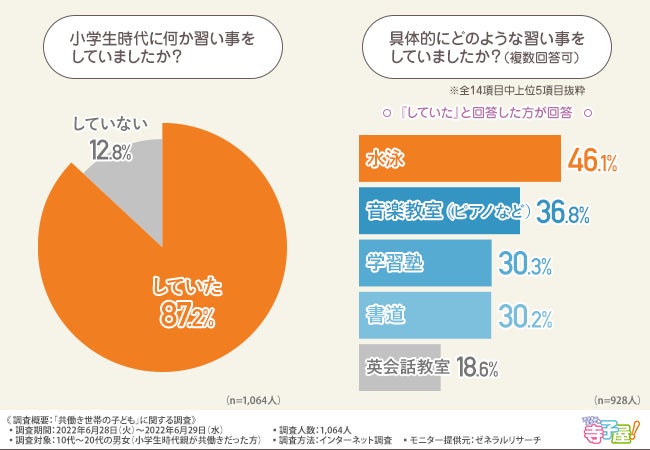そこで、「小学校時代に何か習い事をしていましたか?(複数回答可)」と質問したところ、『していた(87.2%)』『していない(12.8%)』との回答結果になり、実に約9割の方が習い事をしていたことが分かりました。