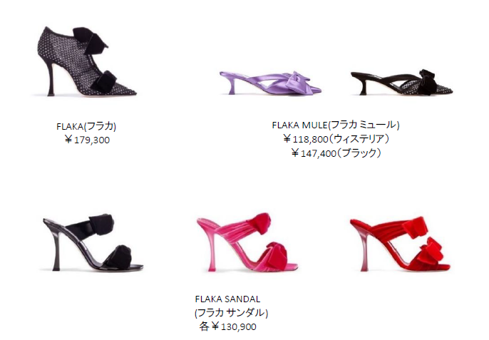 リボンは今季コレクションのメインとなるモチーフです。「FLACA」ブーティとサンダルは、ひときわ大きなリボンが印象的で、まるで自分へのご褒美のよう。光沢感のあるベルベットの「FLACA」サンダルは、リッチなレッド、とびきりフェミニンなキャンディピンクとフューシャのコントラストカラーで登場。その甲にはバタフライリボンがあしらわれています。ヘマタイトクリスタルがあしらわれたフィッシュネットがセクシーな「FLACA」ブーティも、同じ素材の黒いリボンで結われています。5cmヒールの「FLACA」ミュールは、ウィステリア(藤色)のサテンで登場。プレゼントの箱の中のビジューのように、まるで宝物を包み込むようなデザインです。