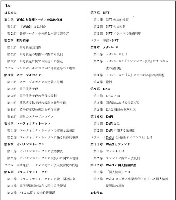 本書は、弊所内の各産業別チームにおける実務対応の知見を基にWeb3ビジネスの構成要素ごとにその法的性質や業規制及び実務上の問題点を解説したWeb3ビジネスの法務についての体系書です。変化の激しいWeb3ビジネスに関して最新の法改正情報や議論等を可能な限り反映をしました。Web3ビジネスに携わる事業者やその法務担当者の方又はそれらを外部から支援する弁護士などの法律専門職の方にとって、Web3ビジネスを法務の面から推進するための一助としていただければ幸いです。