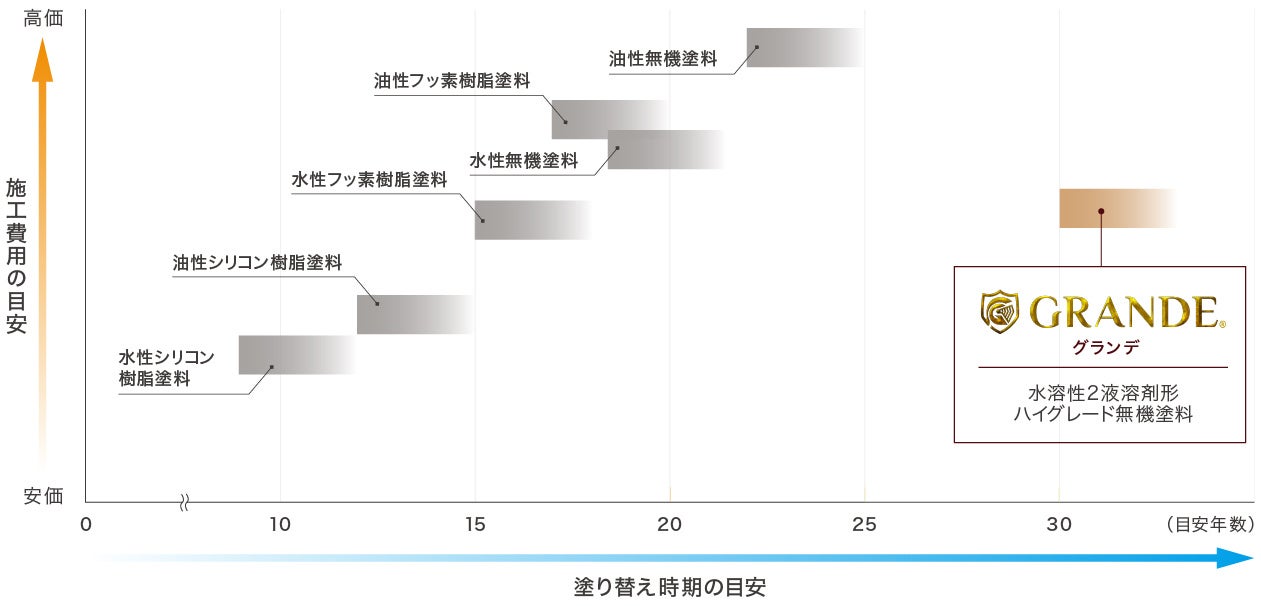 グランデは無機グレード最高クラスの期待耐用年数30年超えを実現。優れたコストパフォーマンスと圧倒的なライフサイクルコストの低減をかなえました。