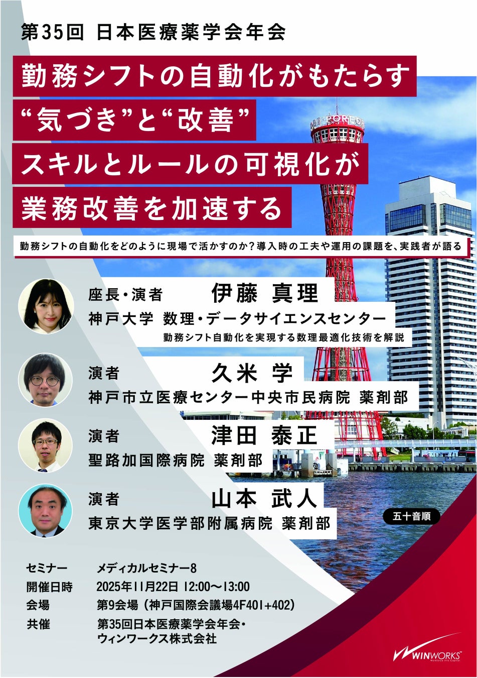 ウィンワークス株式会社(東京都千代田区、代表取締役:森 庸輔、以下「ウィンワークス」)は、2025年11月22日に開催される「第35回日本医療薬学会年会(会場:神戸国際会議場)」において、薬剤部における勤務シフト自動化の「その後の変化」をテーマとした共催セミナーを実施します。