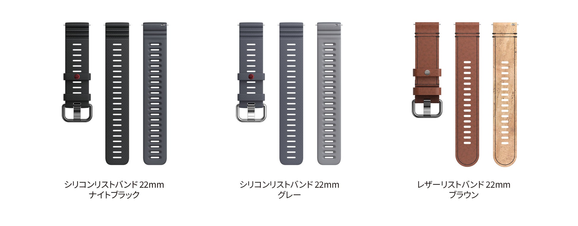 また交換用22mmリストバンドも同時発売いたします。交換用リストバンドは、本体同梱と同じシリコンはナイトブラック、グレーの計2色展開。加えてレザーはブラウンの1色を発売いたします。S-LサイズにはSとM/Lの2サイズのリストバンドが同梱されています。
