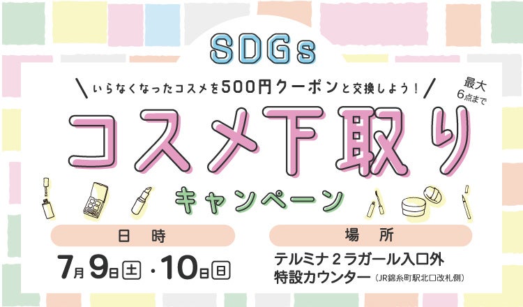 株式会社錦⽷町ステーションビル(本社:東京都墨⽥区 代表取締役:柳 隆夫)が運営するテルミナは、地域の皆さまと共に歩むショッピングセンターを目指して、持続可能な社会の実現に向け「SDGs(持続可能な開発目標)」について「知る」「取り組む」「身近に感じていただく」ことのできる各種イベントを2022年7月より開催いたします。不要になったコスメの下取りイベントをはじめ、ご家庭で取り組めるコンポストワークショップ、障害のあるアーティストのアート展示、エシカルブランド「THREE PANS」の催事イベントを実施いたします。テルミナをきっかけに多くの人がSDGsへの理解を深め、積極的に参加する機会を創出し、地域・社会全体の意欲醸成に繋げることを目指します。